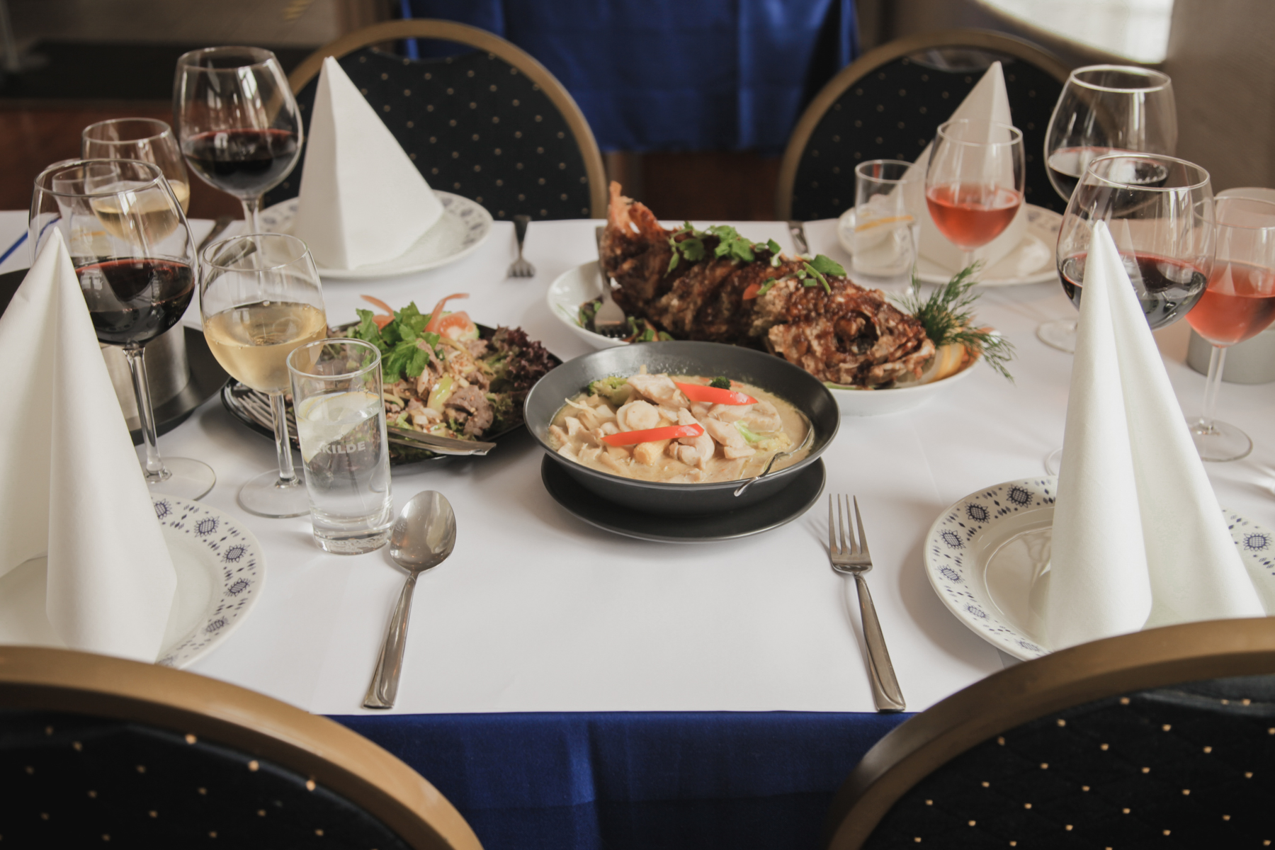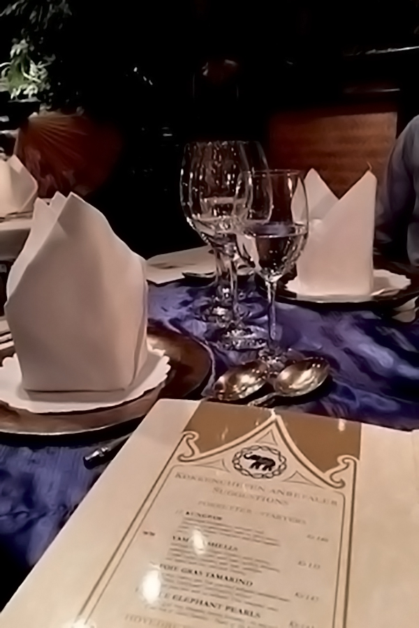 Blue Elephant, located in the Radisson Blu Scandinavia Hotel, has been around since the 90s, though the current owner, Ms. Yupin, didn’t come on board until 2006. The restaurant space is decorated as a “small village,” with rooms that look like Thai homes and marketplaces. There are Thai antiques dotted around between lilies, green plants, and the occasional water fountain.