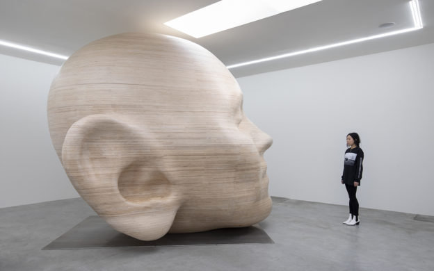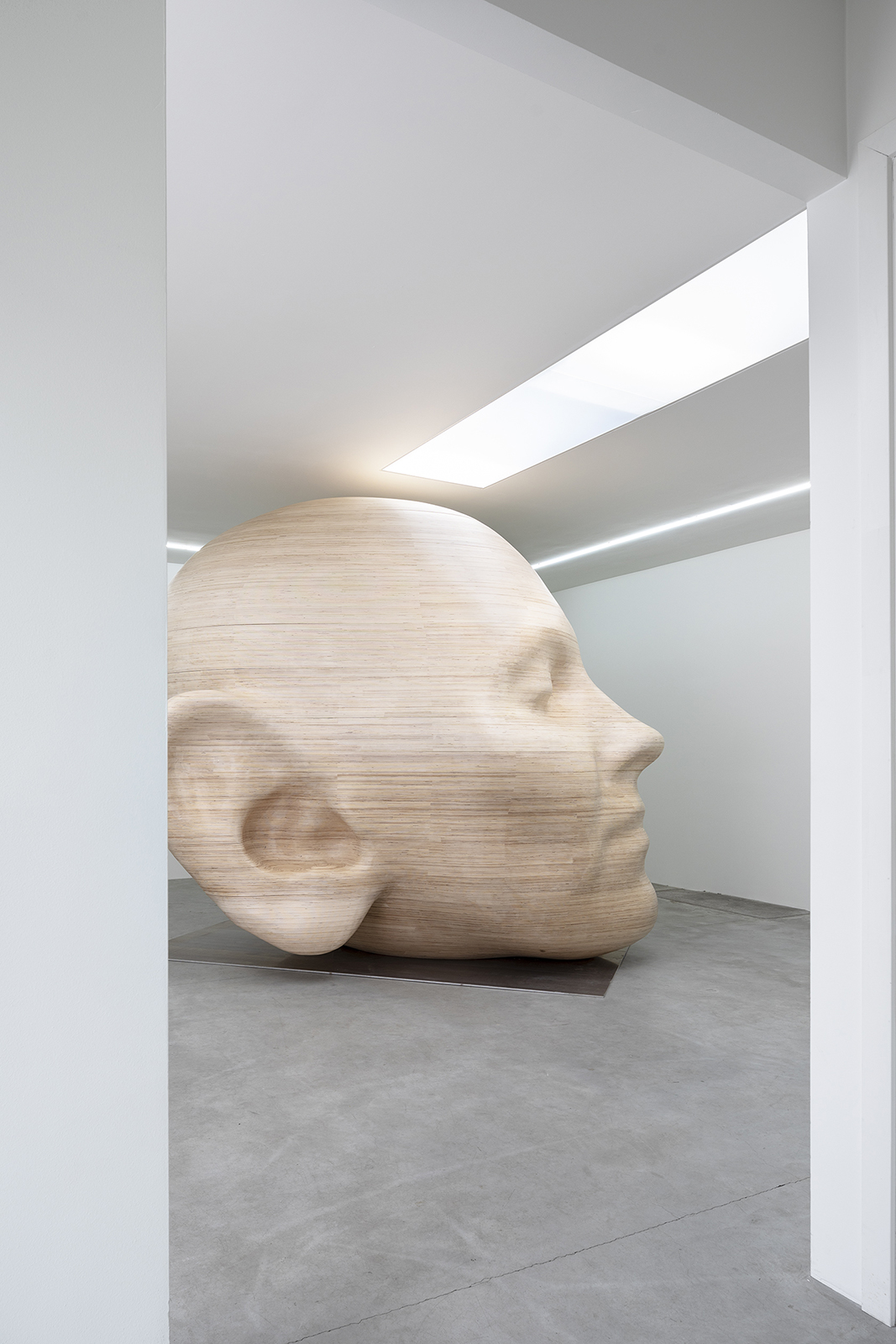 Standing 3.5 meters high and weighing 2.5 tons, her installation, “Tête,” is impressive by any measure. Carved from light beech timber, the polished exterior follows the contours of a human head; inside, ridges cut into the concave walls produce an amphitheater effect.
