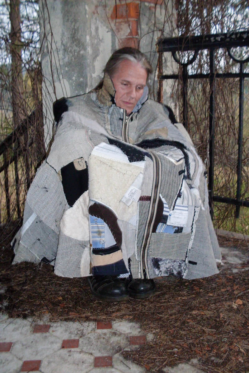 The jacket is made for depression. It only fits if you are sitting down with your legs pressed against your chest. It looks a bit like a tent where you can hide. If you are depressed, it can be difficult to move. The materials used are the linings of the old jackets. I wanted the inside to be outside. This project is one of those few occasions where I made art for the body.