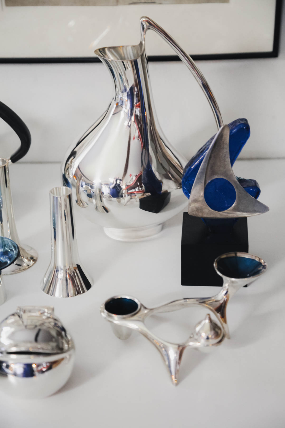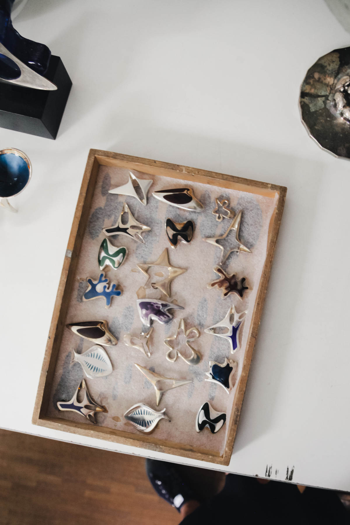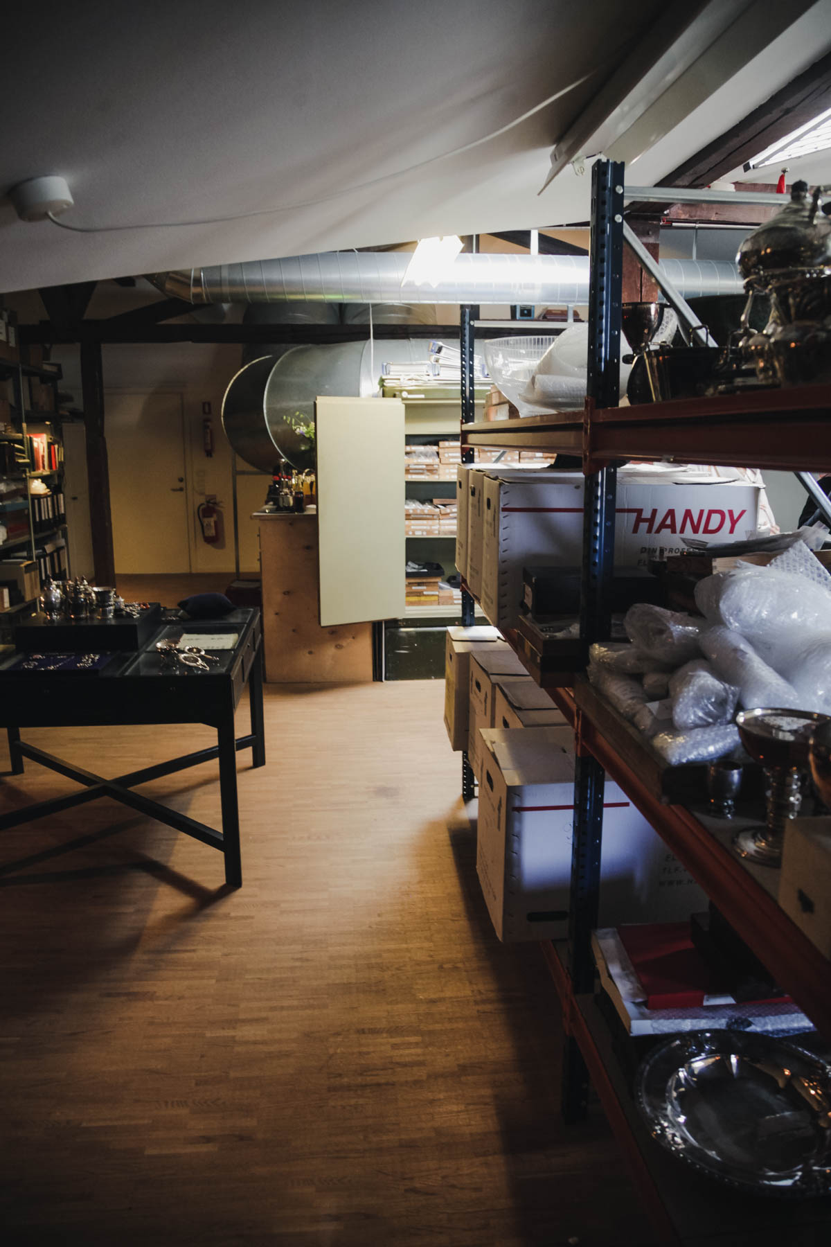 Shelves and cupboards scattered around the room and on the walls hold endless pieces of silver, from milk jugs to bowls to small statues. There’s jewellery from every decade since Jensen began his company – a confirmation belt dotted with amethyst from 1911, and many original pieces from Swedish jewellery designer Vivianna Torun Bülow-Hübe such as the Dew Drop Necklace, and the classic Vivianna watch.