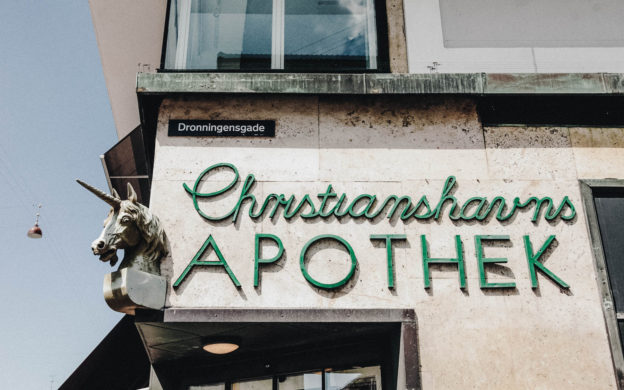 Ironically, although Lagkagehuset is a Funkis pioneer, one of its best known features is a piece of applied art one might expect on a Neoclassical building. Christianshavns Apotek, a pharmacy founded in 1707, moved here when the building opened and still remains to this day. Its trademark is a unicorn head sculpture affixed above the corner entrance. This adornment wasn’t tacked on later; it’s shown in Thomsen’s plans.