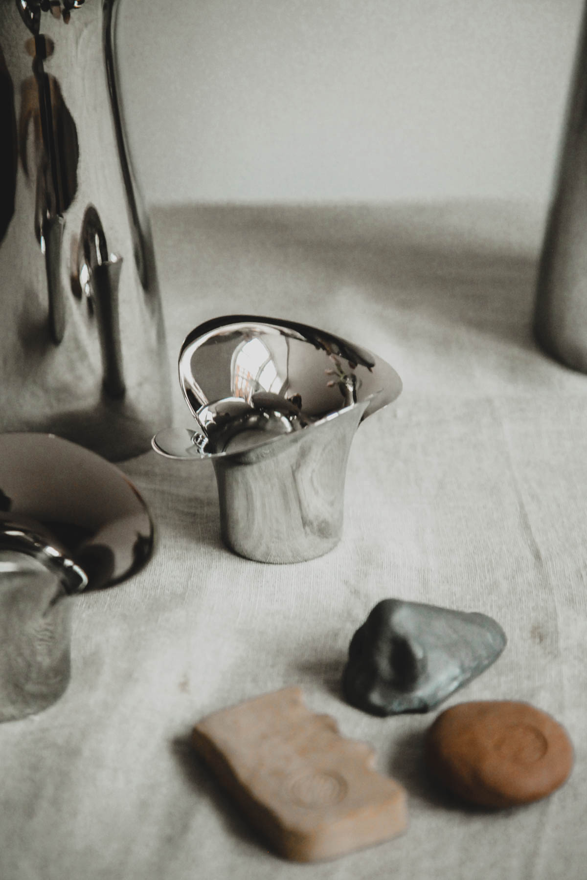 Helle’s process always begins with white clay; she works to get just the right shape and curve to the pieces before casting them and producing in stainless steel. The tactility of the clay reverberates through the steel design – there is something soft about her work that is inexplicable yet inevitable.