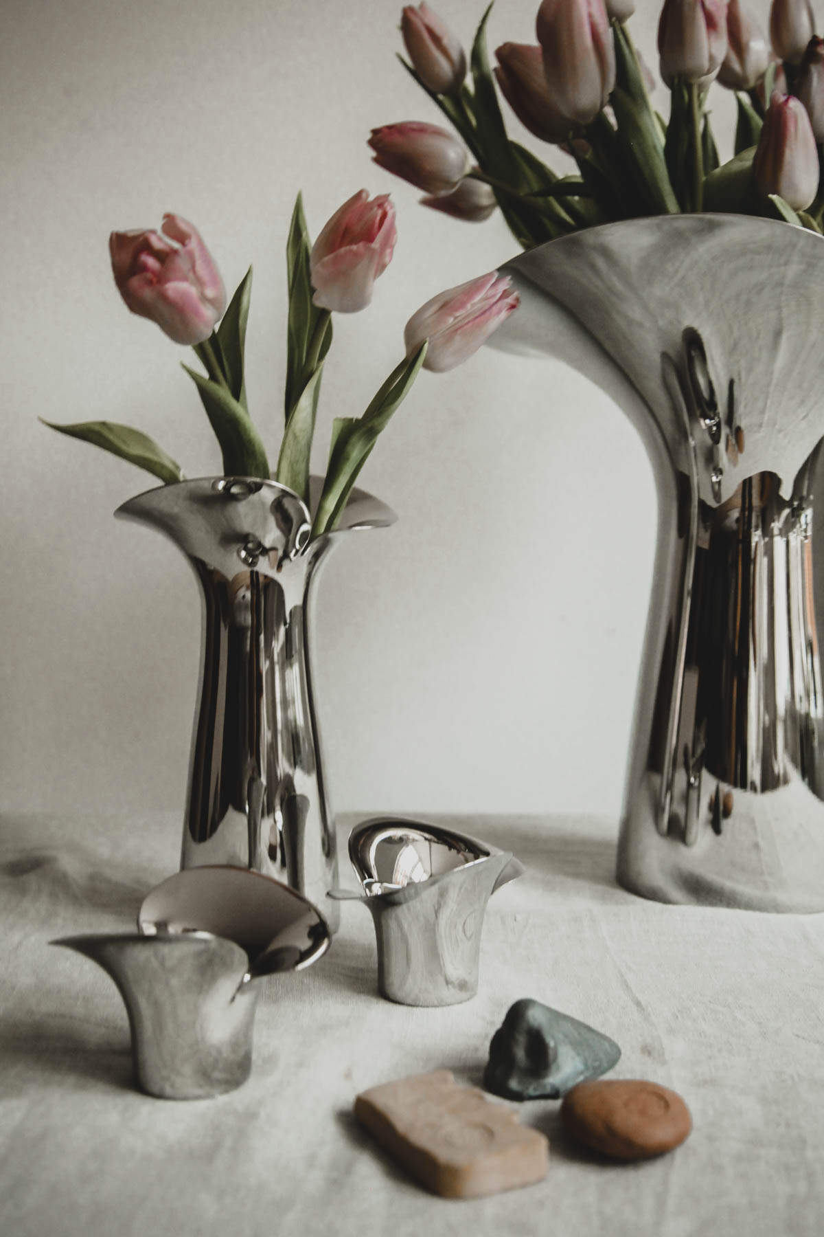 For minimalist interior styles, the sleek steel is ideal, while for romantic or bohemian interior styles, the softness of the organic petal shape is a perfect match. On their own or with flowers, the vases are beautiful sculptures.