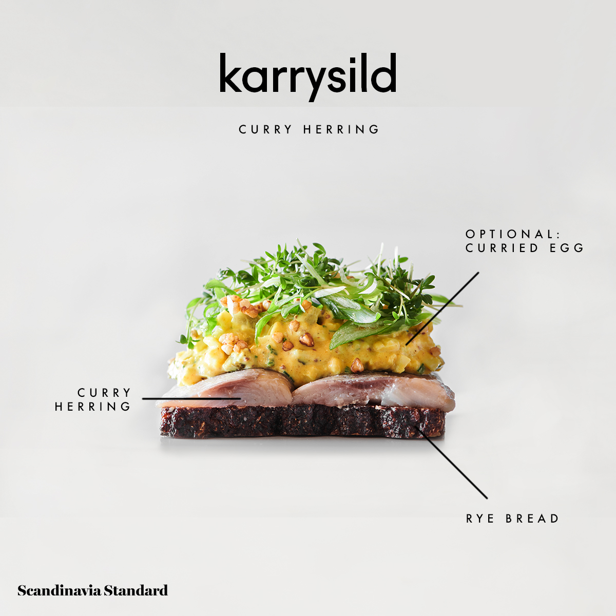 Karrysild is marinated herring that’s been mixed with crème fraîche, mayonnaise, apples, diced pickles and, of course, curry seasoning.