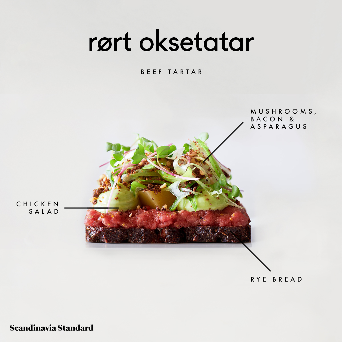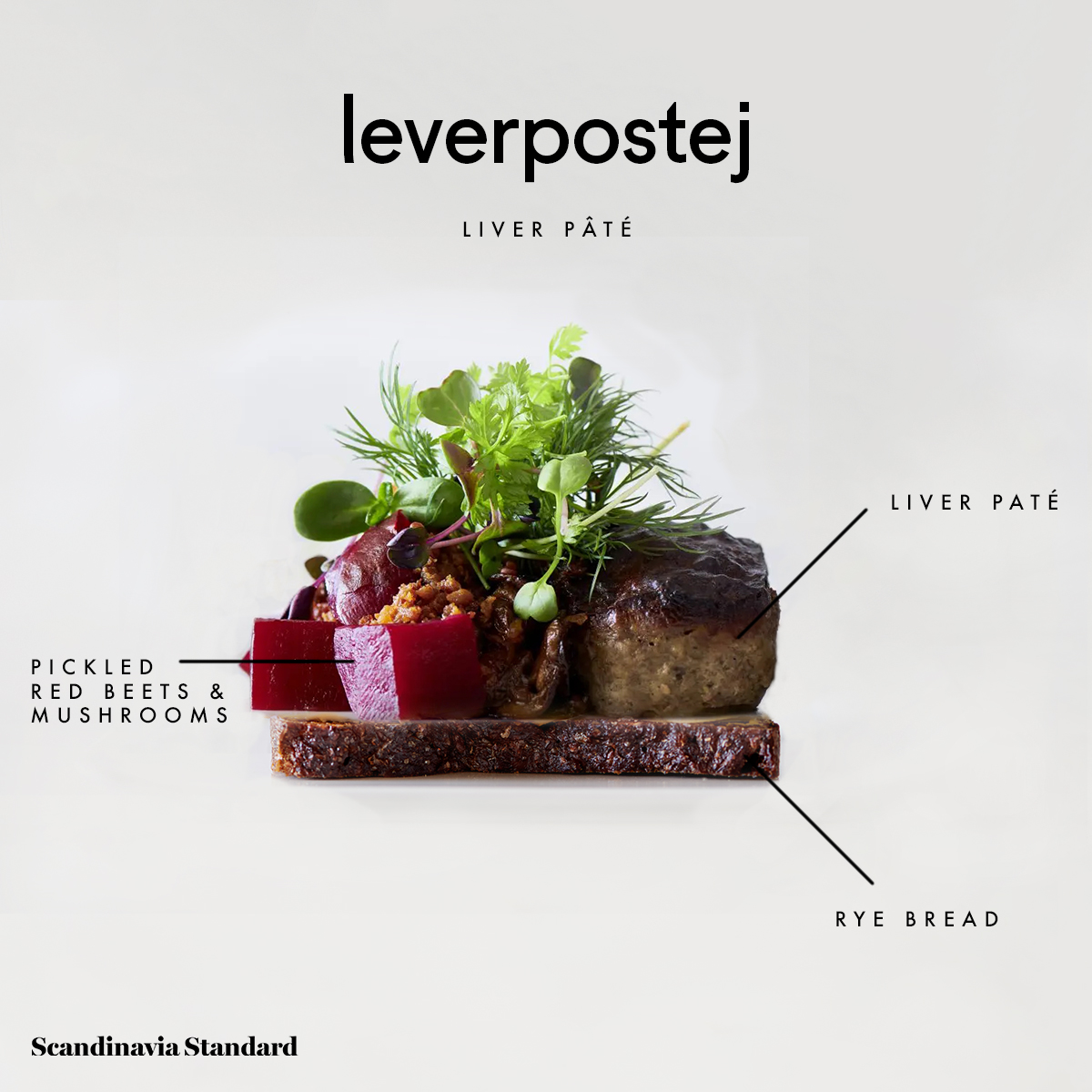 As an open-face sandwich, it’s commonly prepared cold and topped with pickled red beets. Served warm, it’s with bacon, mushrooms, and sometimes, sky (gelitanized au jus).