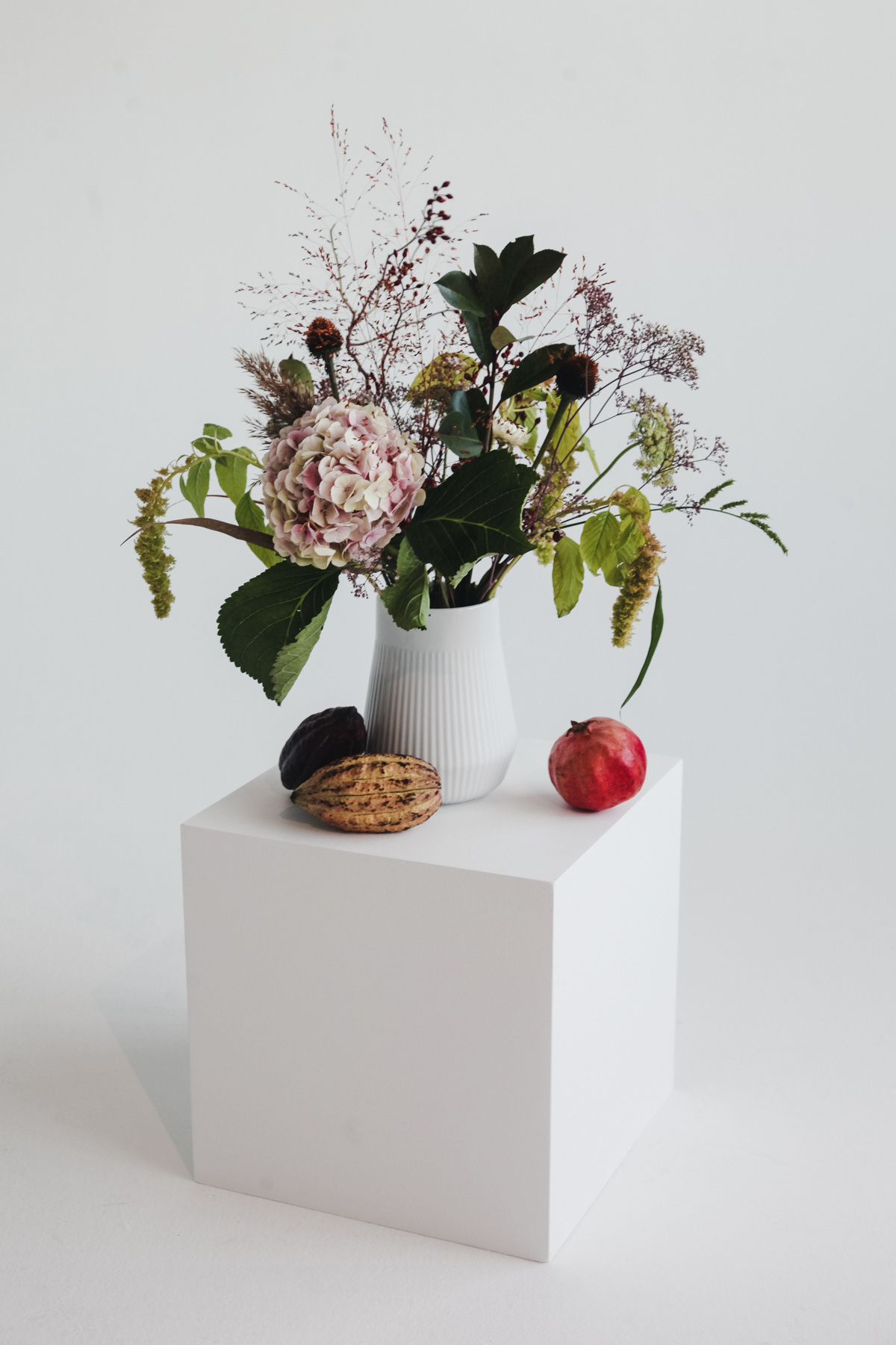 After perfecting the bouquet, we were able to use the studio space at The Lab CPH to style and photograph our work. The incredible light paired with the lush bouquets for a truly gorgeous series of photos. Adding pops of color and texture, such as fabric, fruits, and colorful backdrops, allowed us to really dig into still-life inspiration like the works of Dutch Masters such as Vermeer and van Huysum.