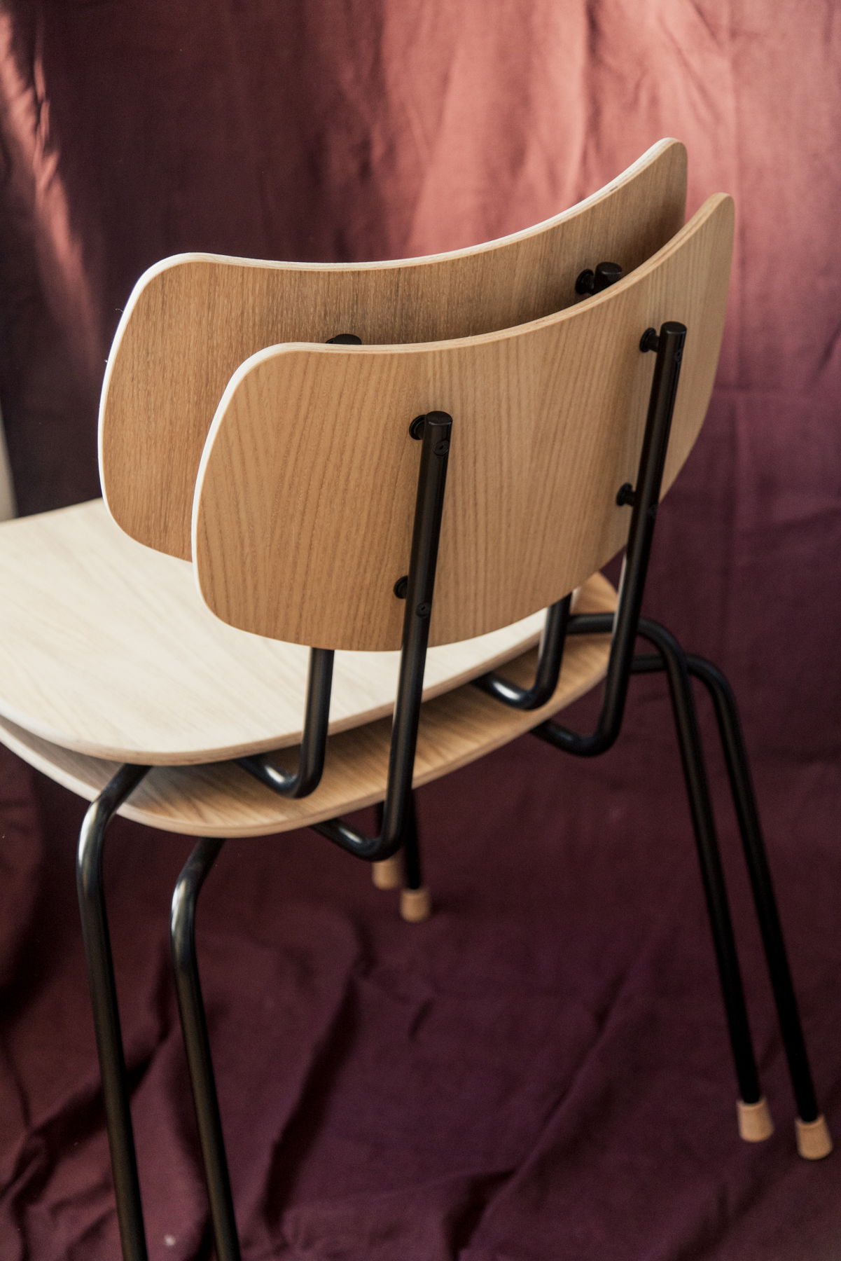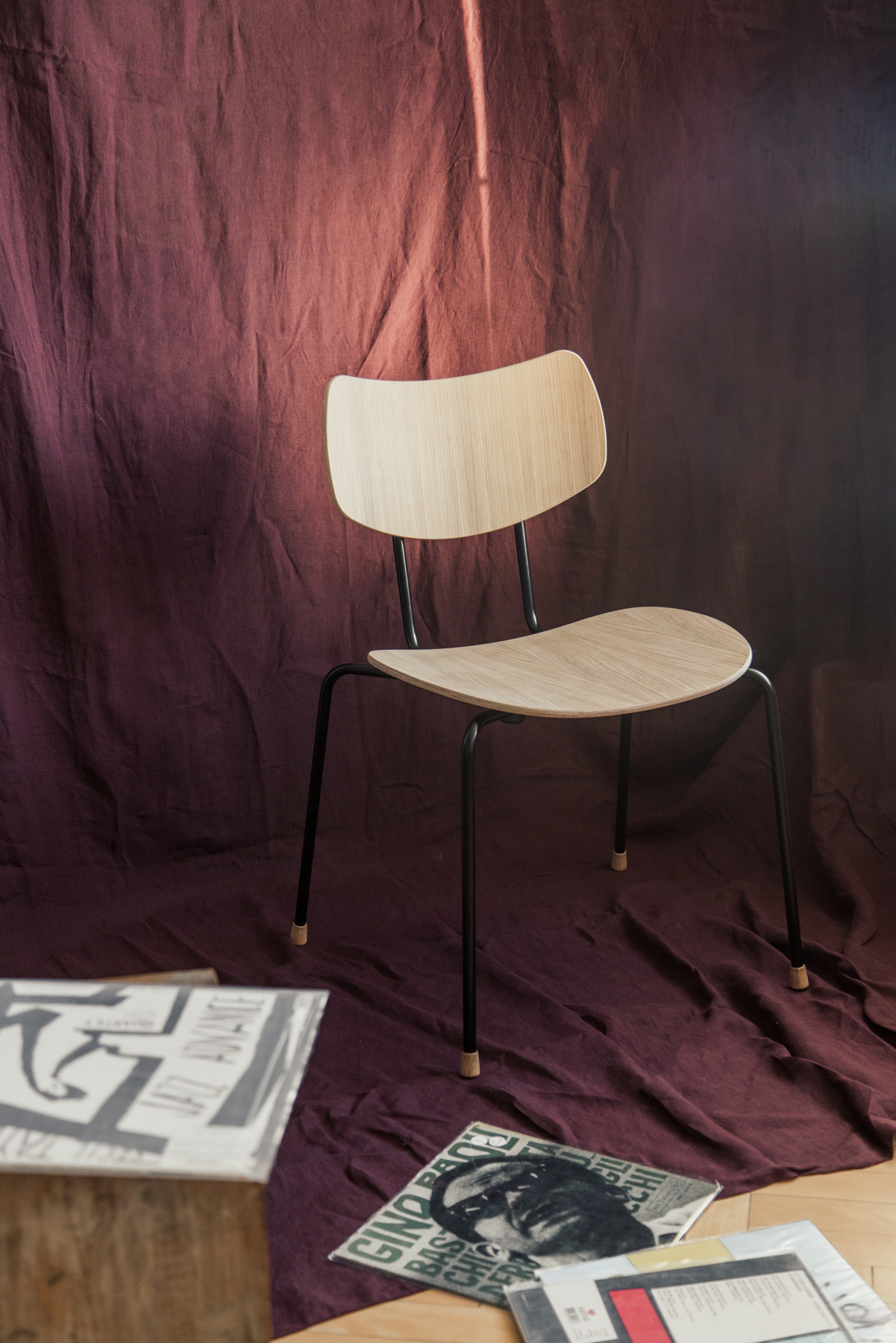Materials: FSC-certified oak, powder-coated steel. Chairs are also available with textile or leather upholstery on the seat and backrest