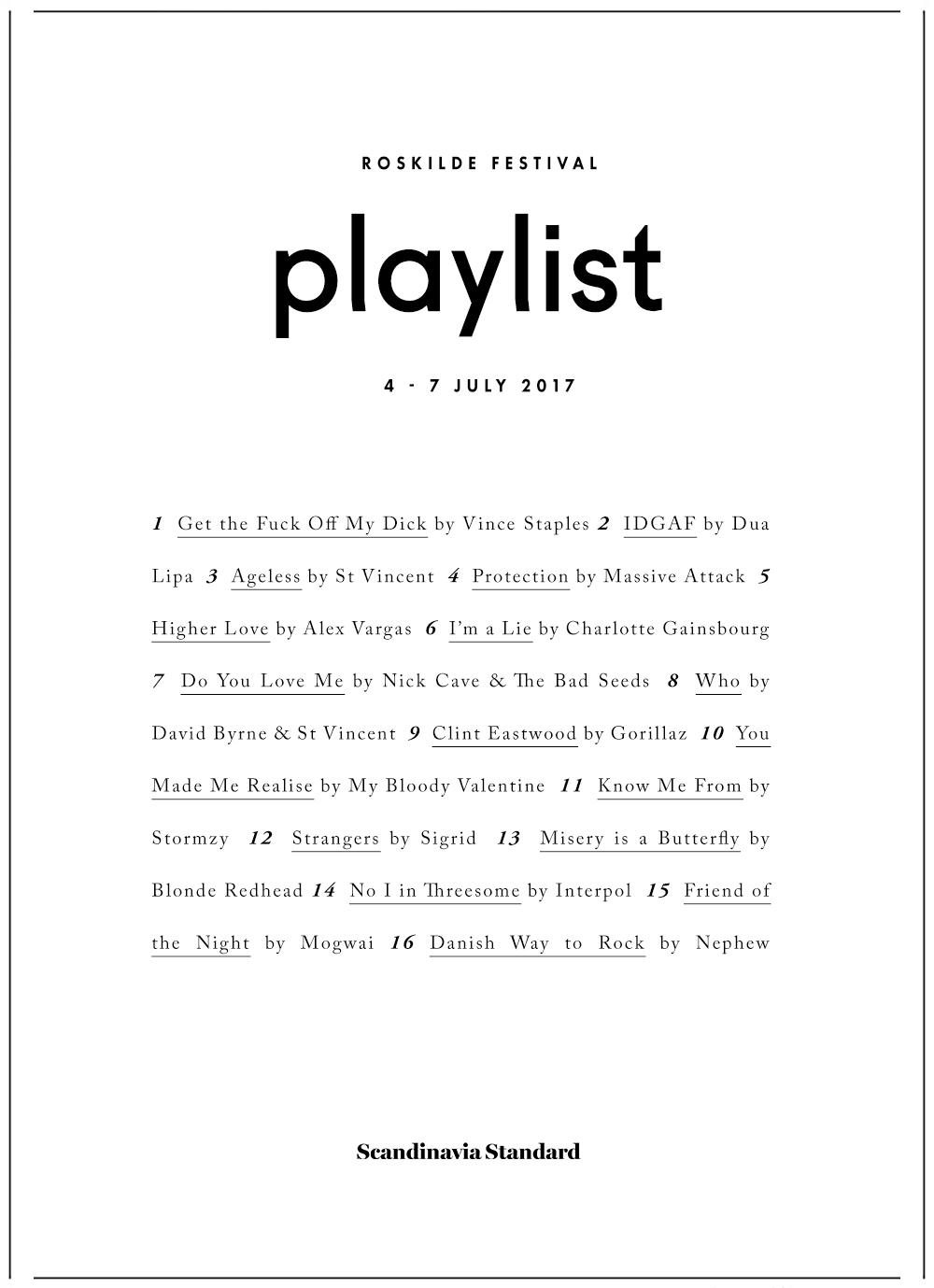 Roskilde Festival, the largest rock festival in Northern Europe, takes place from 30th June – 7th July. As always, we can’t wait for the food, the fashion, and of course, the music. This year’s headliners include Dua Lipa, St Vincent, Gorillaz, Eminem, Nick Cave & the Bad Seeds, Vince Staples, Interpol, Stormzy, and many more. While we haven’t included every headliner in our playlist, we’ve cherry-picked the songs that are getting us excited for this year’s festival.