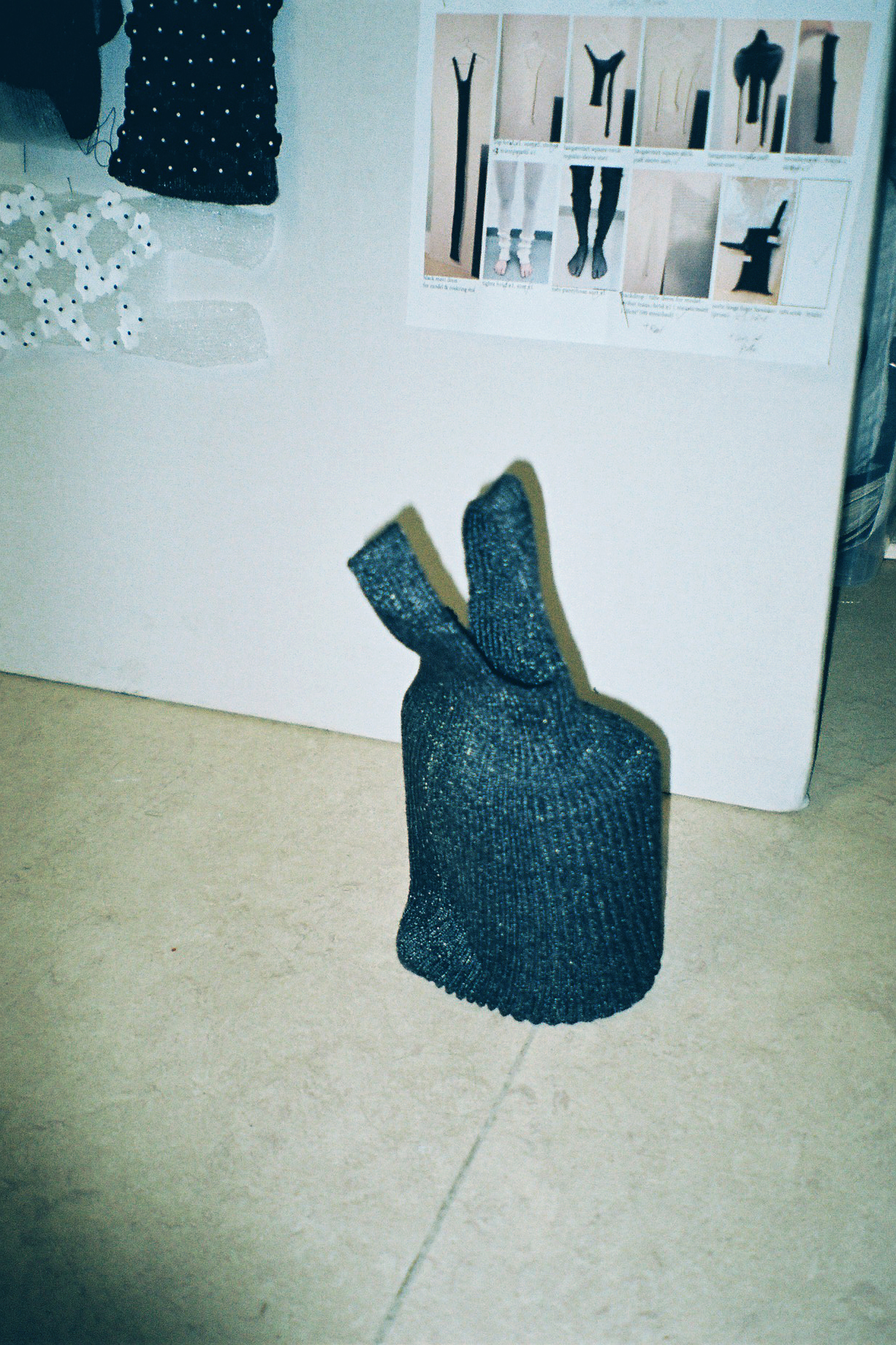 Danish knitwear designer A. Roege Hove started with her now iconic knit bags and has moved on to clothing as well. Her incredible creations are knit so that the thing inside, whether it be a body or handbag items, give the knit shape – a different and unique sculpture every time.