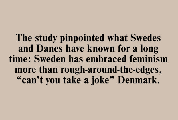 The study pinpointed what Swedes and Danes have known for a long time: Sweden has embraced feminism more than rough-around-the-edges, “can’t you take a joke” Denmark.