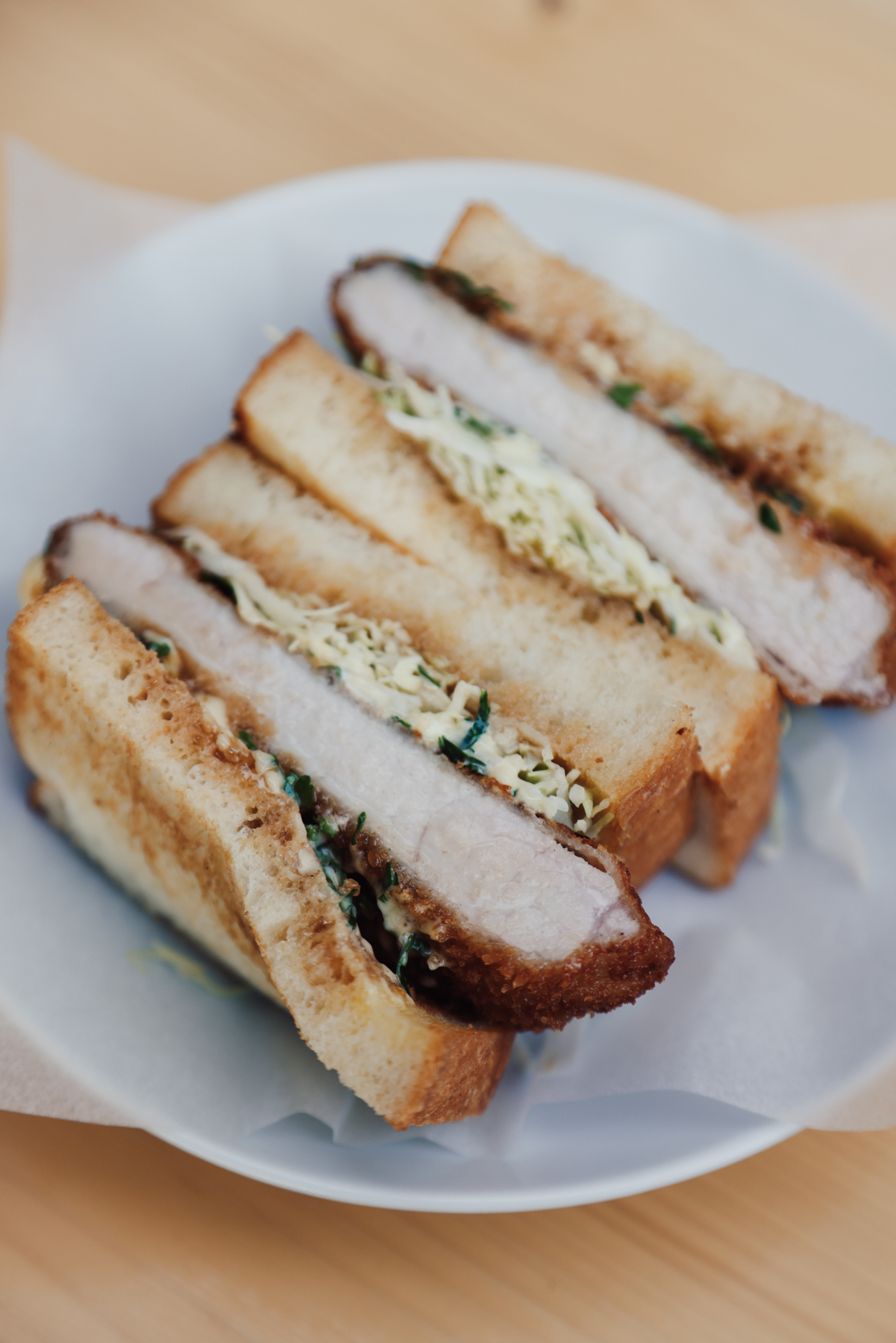 Milk Bread Sandwich with Breaded Pork Loin Cutlet, Cabbage, Parsley, Mayo & Tonkatsu sauce.