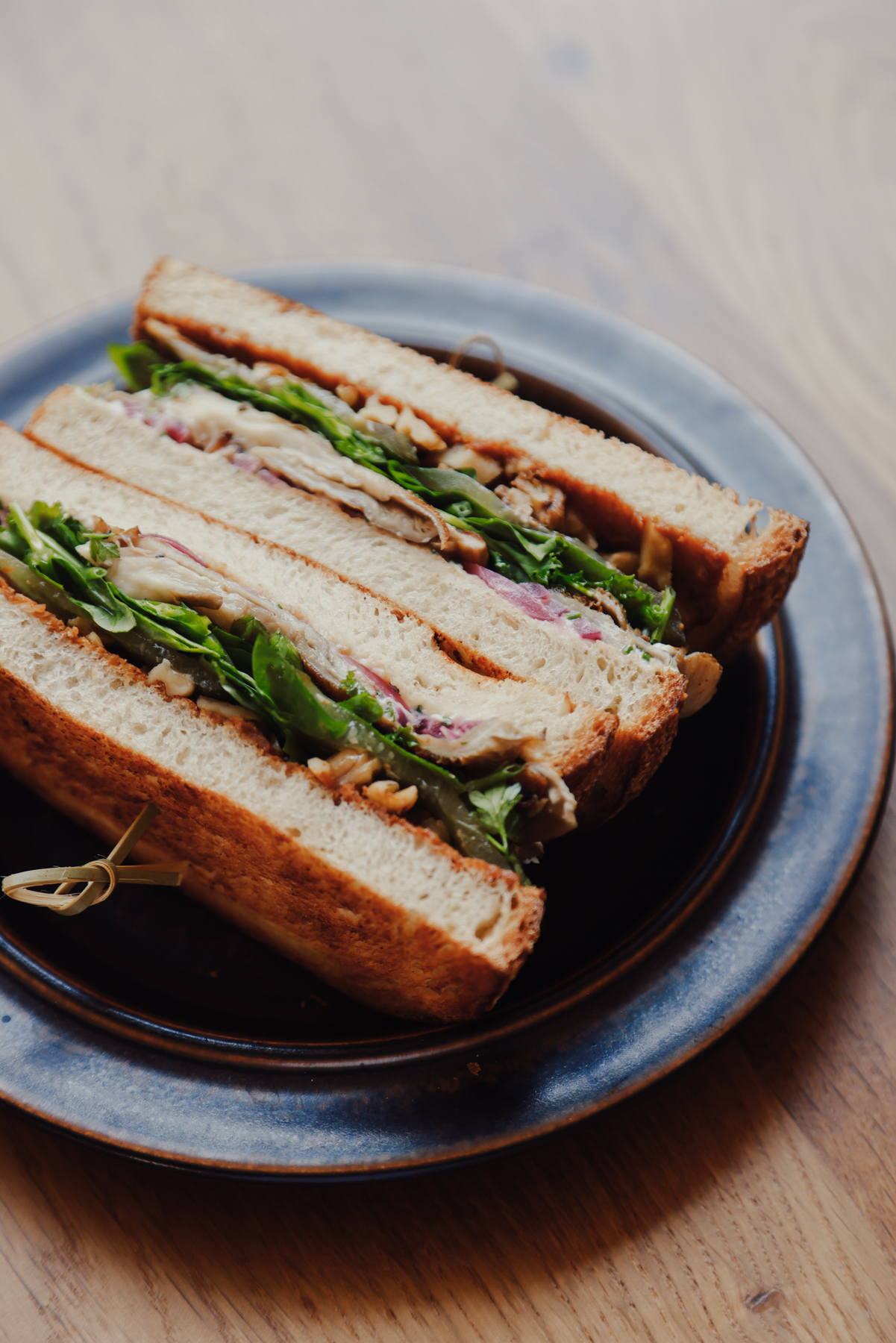 “It’s based on our milk bread, adapted from Japanese sweet milk bread, that we bake in-house with unsweetened soy milk. It’s made fresh every single morning. The blue oyster mushroom comes from our co-owned farm, which is in the Nordvest neighborhood of Copenhagen, so we grow these mushrooms ourselves as well. It has a nice little spice mix that resembles pastrami. Inside is a miso and walnut mixed herb salad with pickled onions and gherkins, all pickled in-house. The miso spread is also homemade.”
