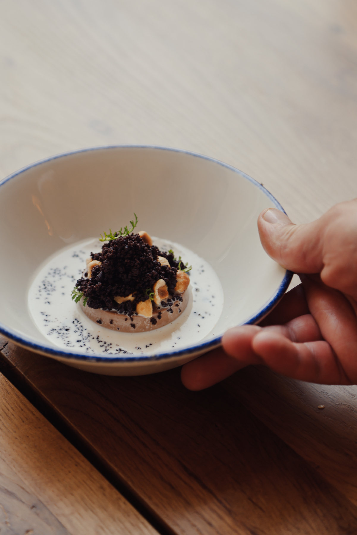 “This dish is made with hazelnut milk and roasted hazelnuts, made to play on the flavors of Ferrero Rocher and Nutella: chocolate and hazelnut. There’s a chocolate hazelnut Marquise (like a chocolate mousse). There’s hazelnut praline folded through the mousse. You really can’t go wrong with those flavours!”