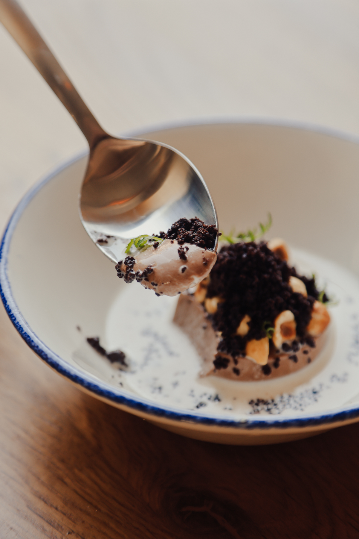 “This one is our summer salad, based on our almond ricotta. We make this ricotta in-house. It’s a mix of soaked, blitzed almonds, plus we make an almond cream cheese. It takes about three days to make. We use the whey from one of the cocktails in the bar to mix together in a ratio that gives a ‘ricotta-feel’ for the cheese. It has brined and charred apricot with Danish peas, dressed with a bit of citronette, and pea sprouts, chive flowers, and some grated almonds. We do this for brunch and on the dinner menu.”