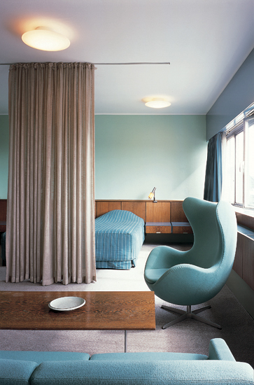 Several Danes embraced Functionalism and one in particular, Arne Jacobsen, emerged as an architect of the caliber of Aalto and Asplund. Jacobsen’s notable projects included an elegantly designed Functionalist beachfront community in the 1930s comprised of Bellavista Apartments, Bellevue Theater, and beach structures, including sleek lifeguard stands, on the outskirts of Copenhagen and his SAS House of 1960, his most accomplished gesamtkunstwerk (total work of art) which spawned the best-selling Egg and Swan chairs.