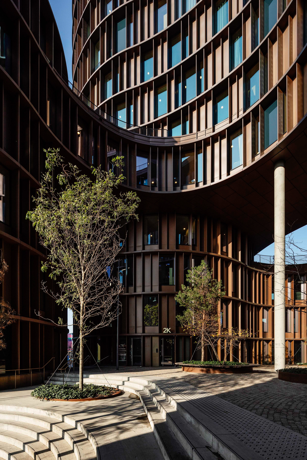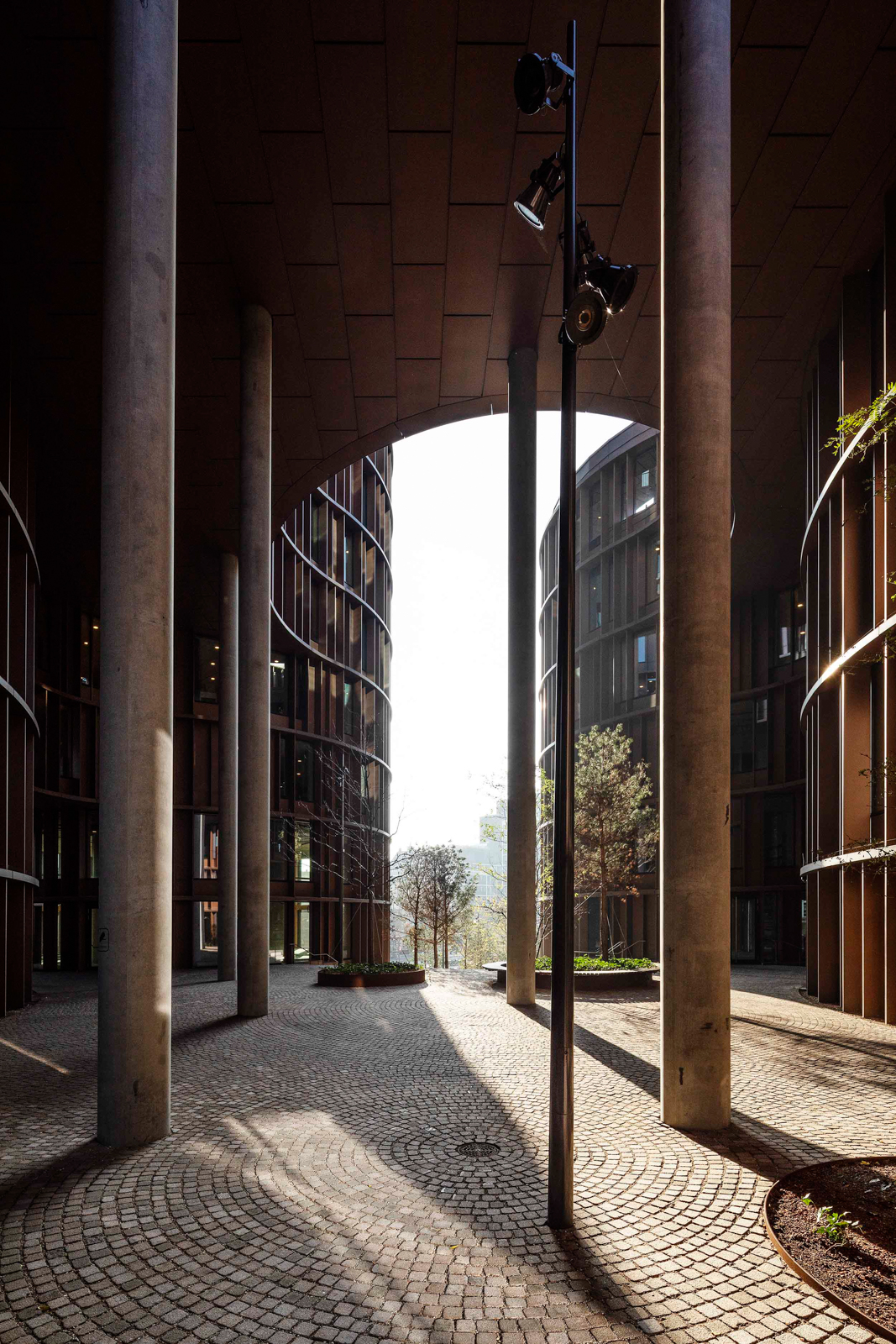 Another popular recent building is Axel Towers, completed in 2017, a commercial complex of five rounded sections of varying heights with a tombac and glass facades, by Lundgaard & Tranberg Arkitekter.