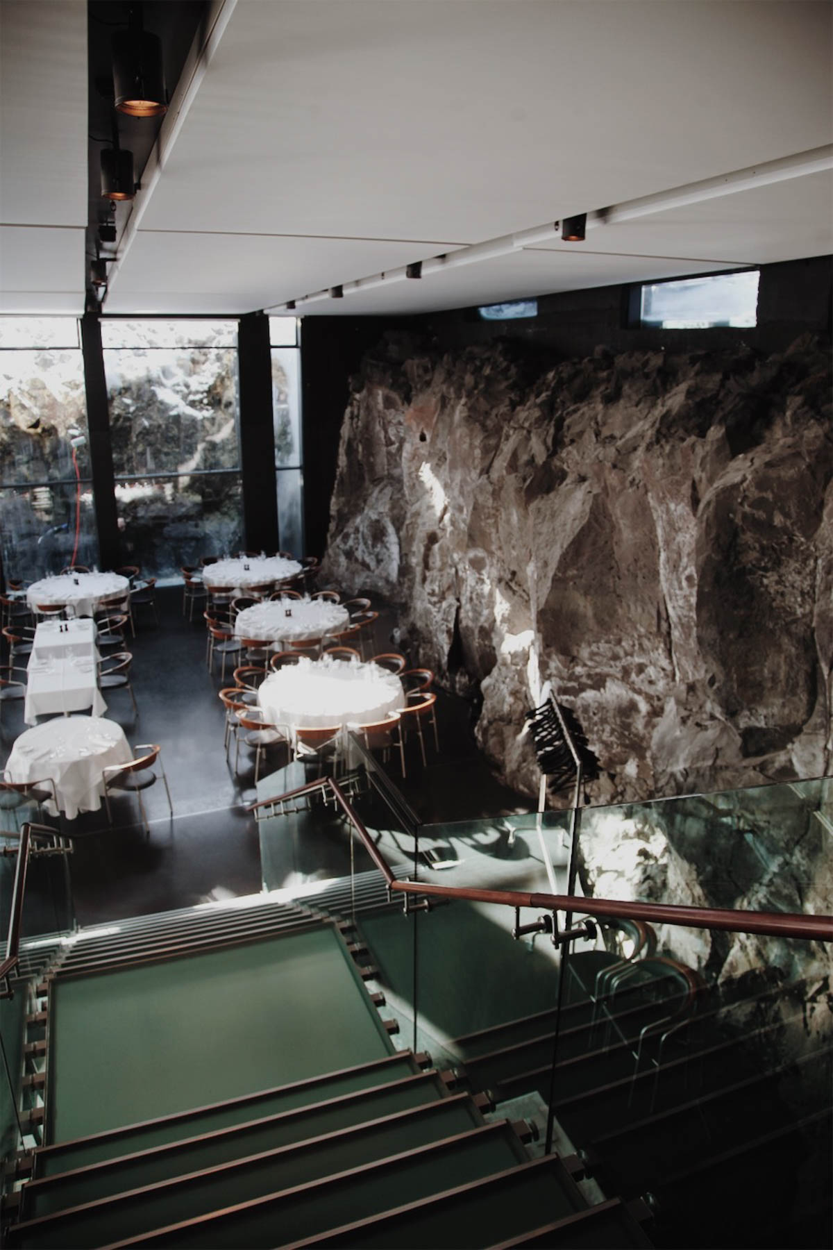 There is a chef’s table near the open kitchen made from lava, and a magnificent wine cellar deep underground with walls also formed from lava, colored a rusty-red due to oxidation. Those who book the chef’s table – a seven course meal – also get a tour of the wine cellar. If you’re sitting elsewhere, ask if you can get a peek!