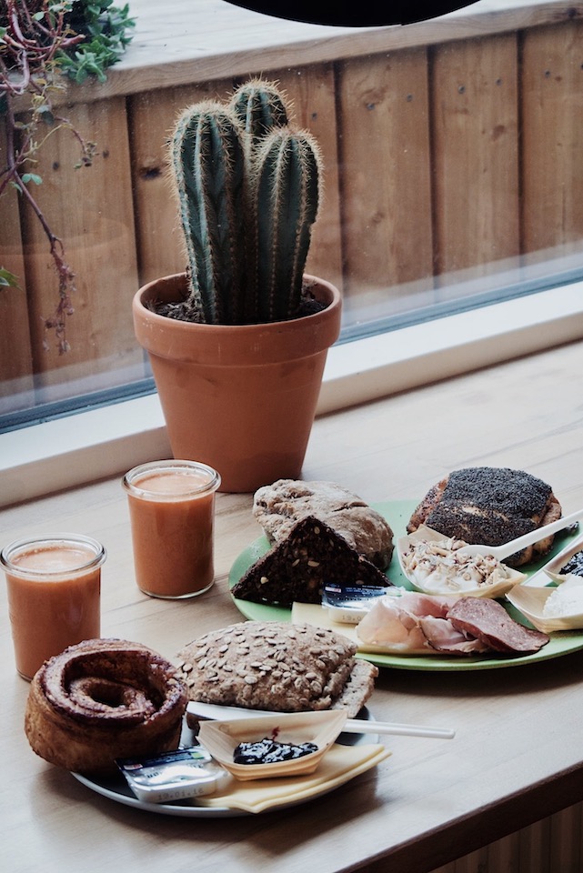 Zoku Copenhagen, a apartment hotel building in Amager, has a fantastic breakfast and brunch spot that’s on their top floor, nestled in a greenhouse-like space filled with plants. The open-plan kitchen and large windows make the space feel light and inviting.