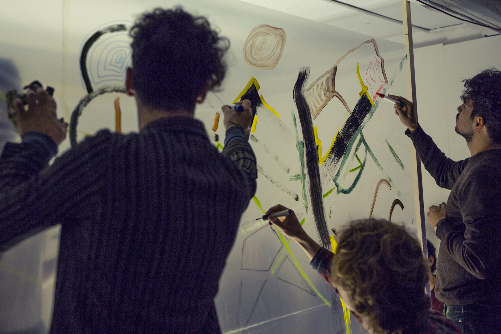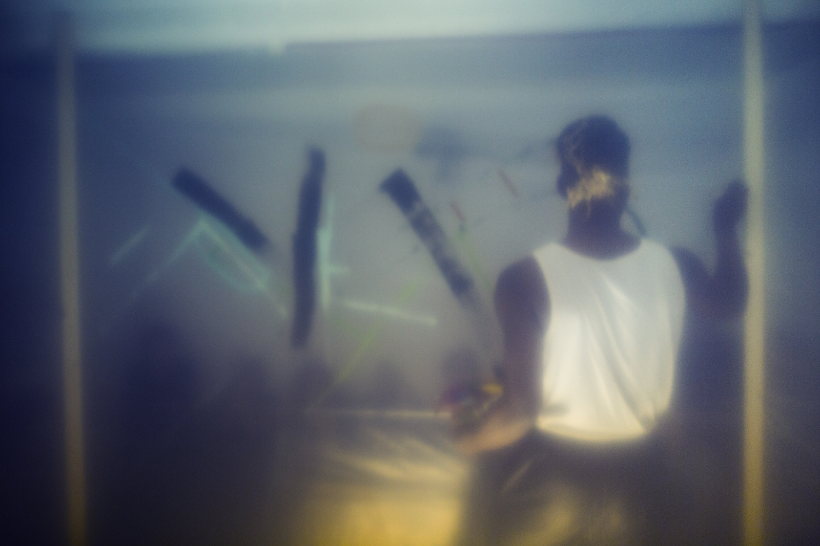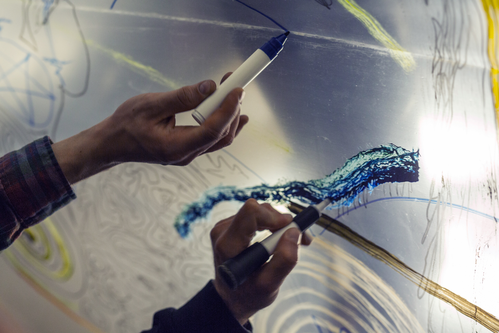 Enclosed in a transparent cube, French artist Emmanuel Afanyiakossou-Gba-Gba dabbed paint onto the internal surfaces of the cube, whilst taped audio of peoples’ dream-state experiences broadcast around the room. Starting as a trickle, audience members picked up marker pens placed beneath the canvas, adding their own hand-drawn impressions to its exterior.