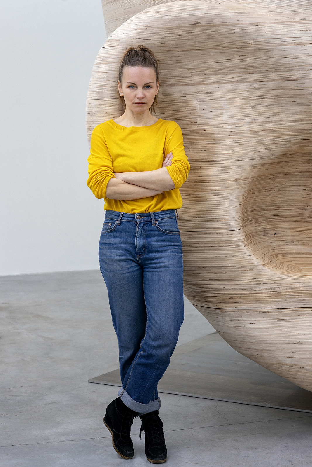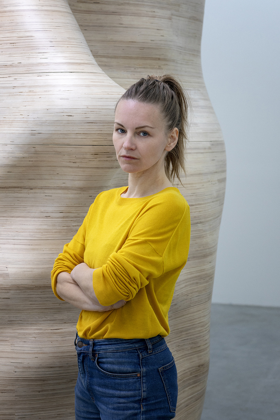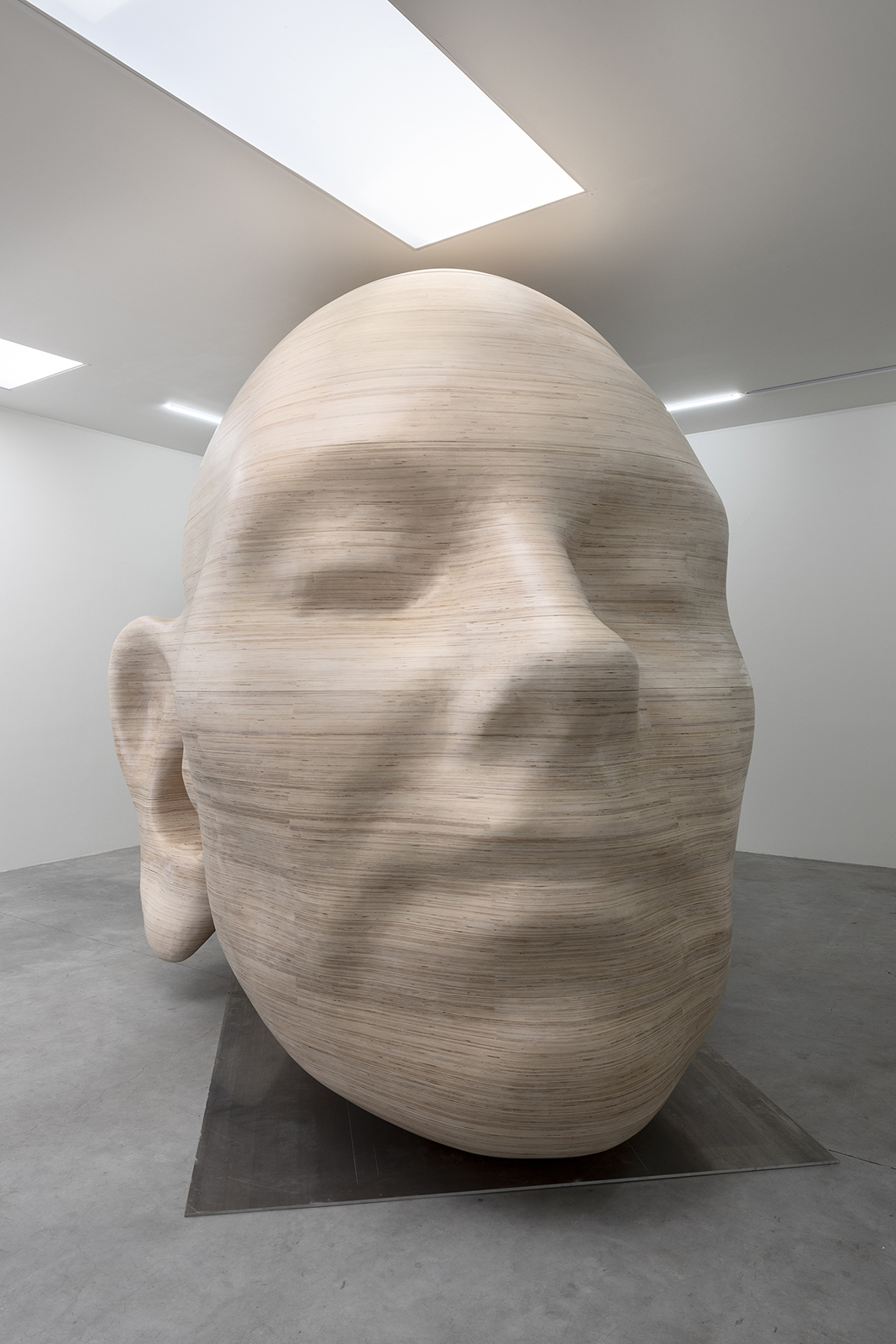 Standing 3.5 meters high and weighing 2.5 tons, her installation, “Tête,” is impressive by any measure. Carved from light beech timber, the polished exterior follows the contours of a human head; inside, ridges cut into the concave walls produce an amphitheater effect.