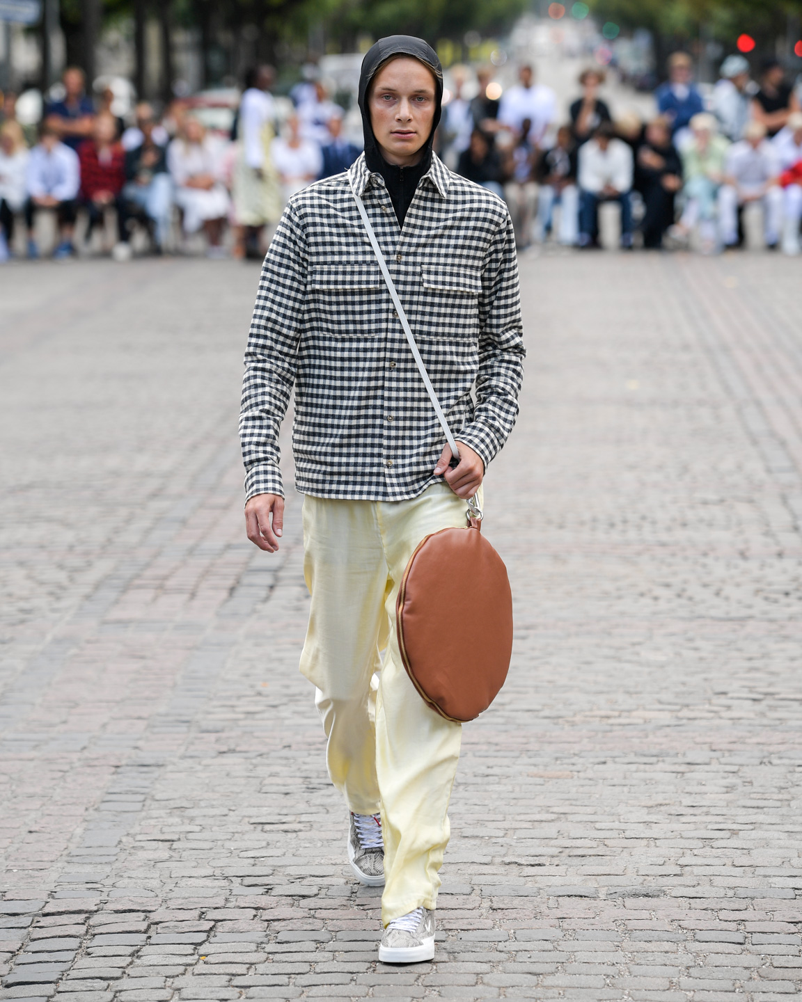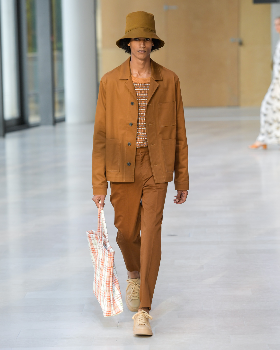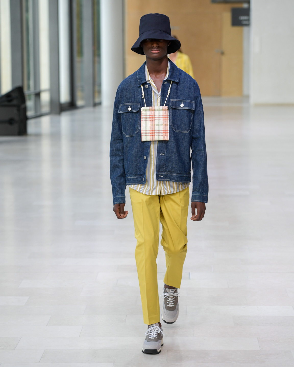 In the beautiful venue of Statens Museum for Kunst, Samsøe Samsøe presented a vision for spring-summer 2020 that is effortlessly chic with a nod to workwear. The collection featured classical menswear silhouettes, neutrals, denim, checks, and stripes. Bucket hats and pants that brought to mind Boy Scout uniforms added an utilitarian aesthetic. A highlight of the show was a small leather bag, á la Jacquemus, worn across the model’s neck, cross-body, and as a belt.