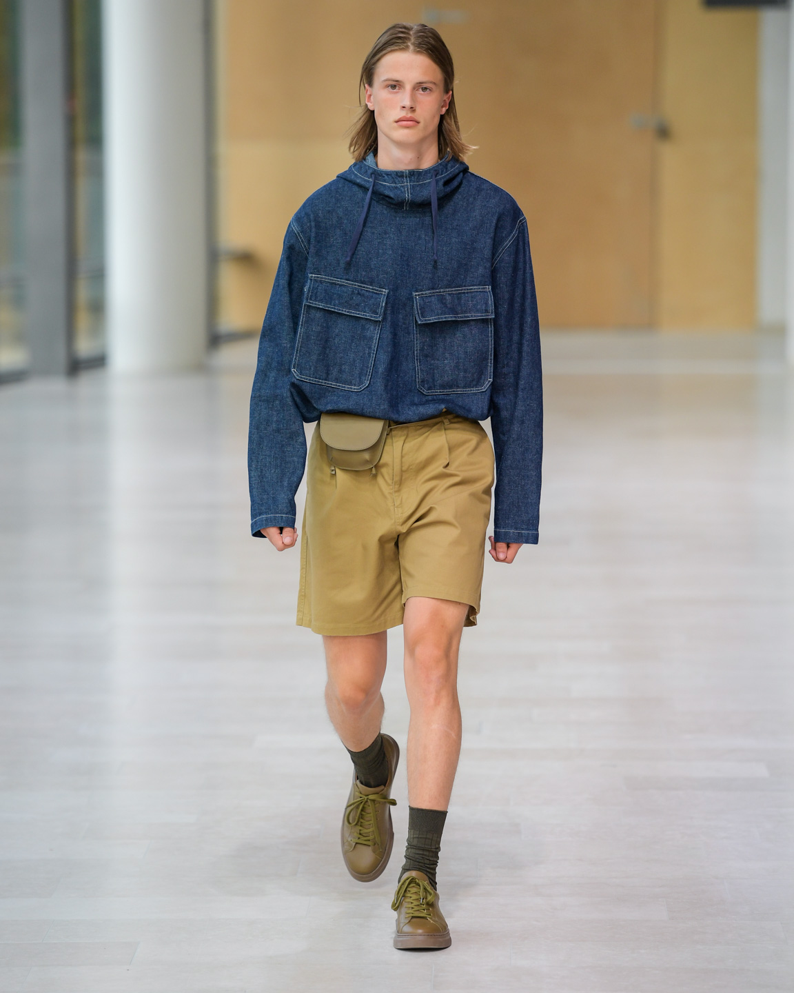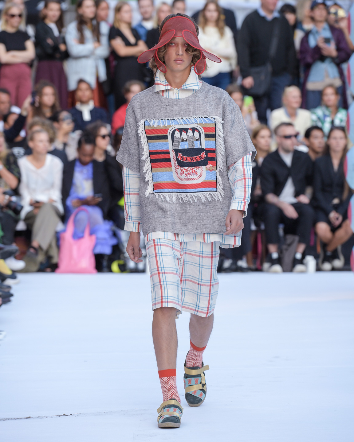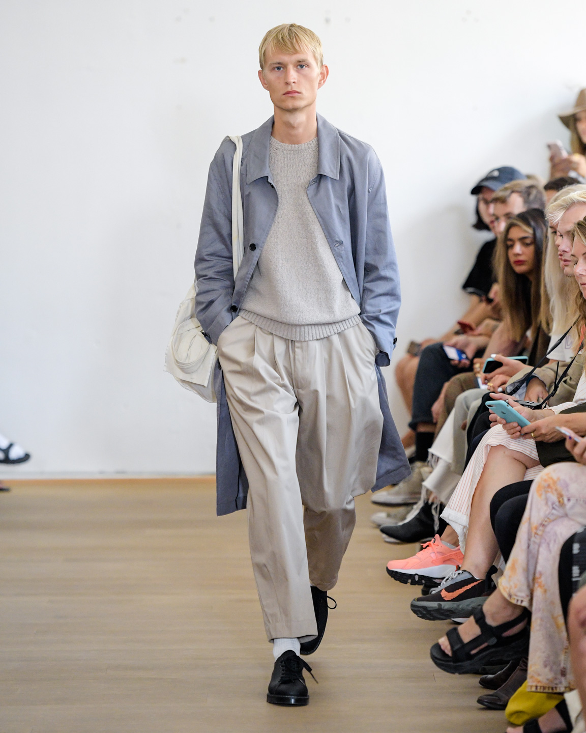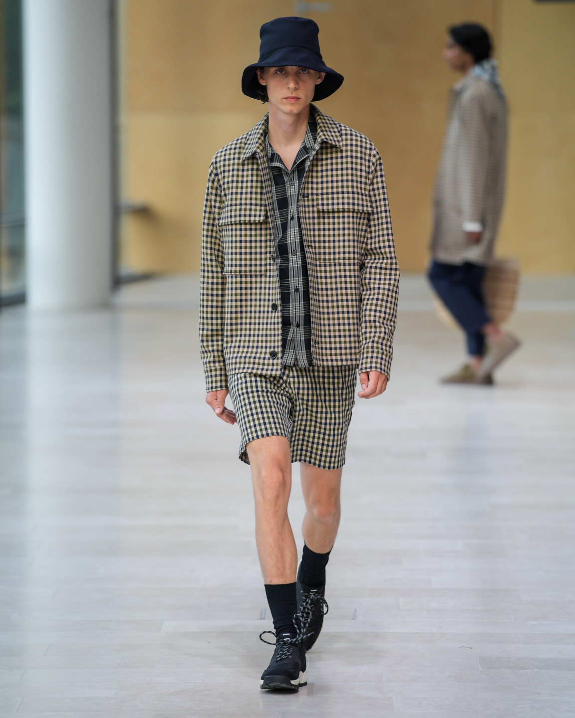 In the beautiful venue of Statens Museum for Kunst, Samsøe Samsøe presented a vision for spring-summer 2020 that is effortlessly chic with a nod to workwear. The collection featured classical menswear silhouettes, neutrals, denim, checks, and stripes. Bucket hats and pants that brought to mind Boy Scout uniforms added an utilitarian aesthetic. A highlight of the show was a small leather bag, á la Jacquemus, worn across the model’s neck, cross-body, and as a belt.