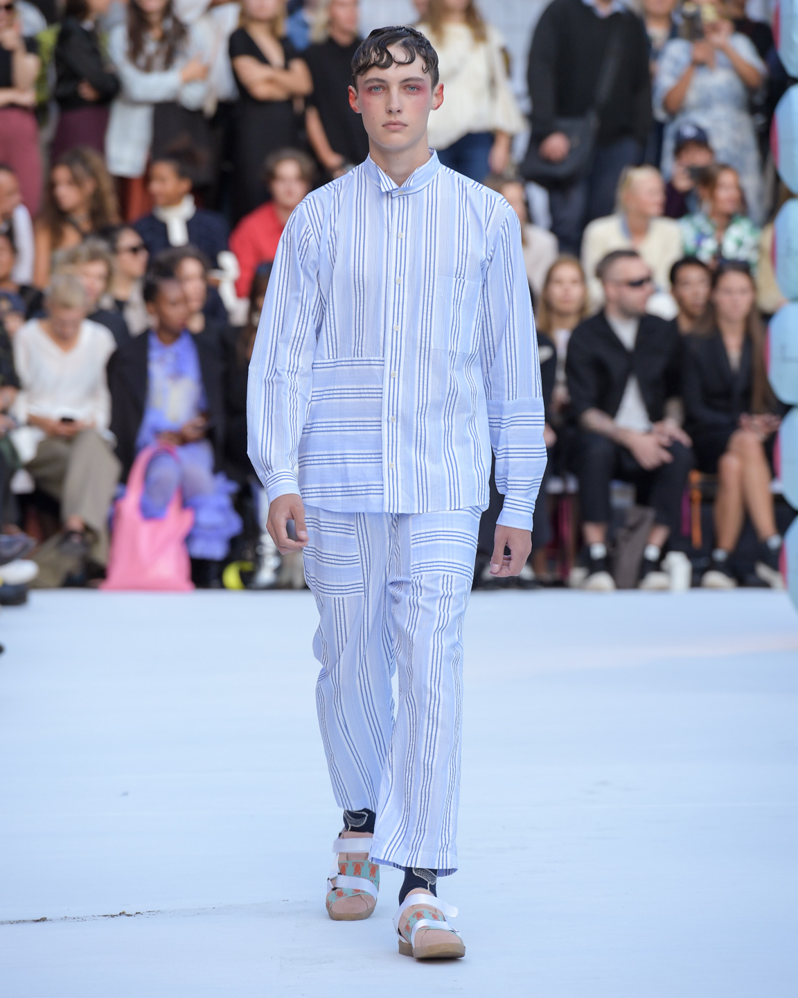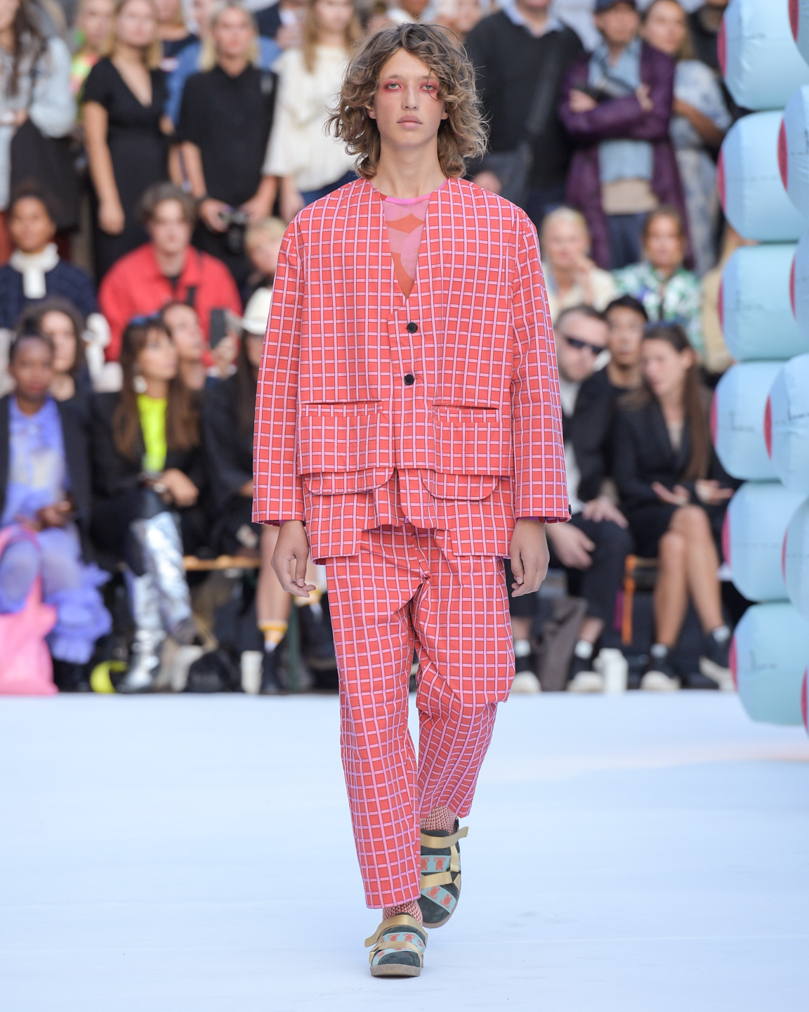 Henrik Vibskov debuted his spring-summer 2020 collection at Paris Men’s Fashion Week but returned to Copenhagen for another presentation. “Stuck Under the Surface” was a mix of runway show and performance art, as is Vibskov’s calling card, with the vibe of an open air summer rave. The collection featured playfully combined geometrical patterns, embroidery, layering, and oversized silhouettes. Accessories, hair styles, and make up evoked images of apocalyptic scenes in a dreamy fantasy world. Welcome back, Henrik, Copenhagen missed you!