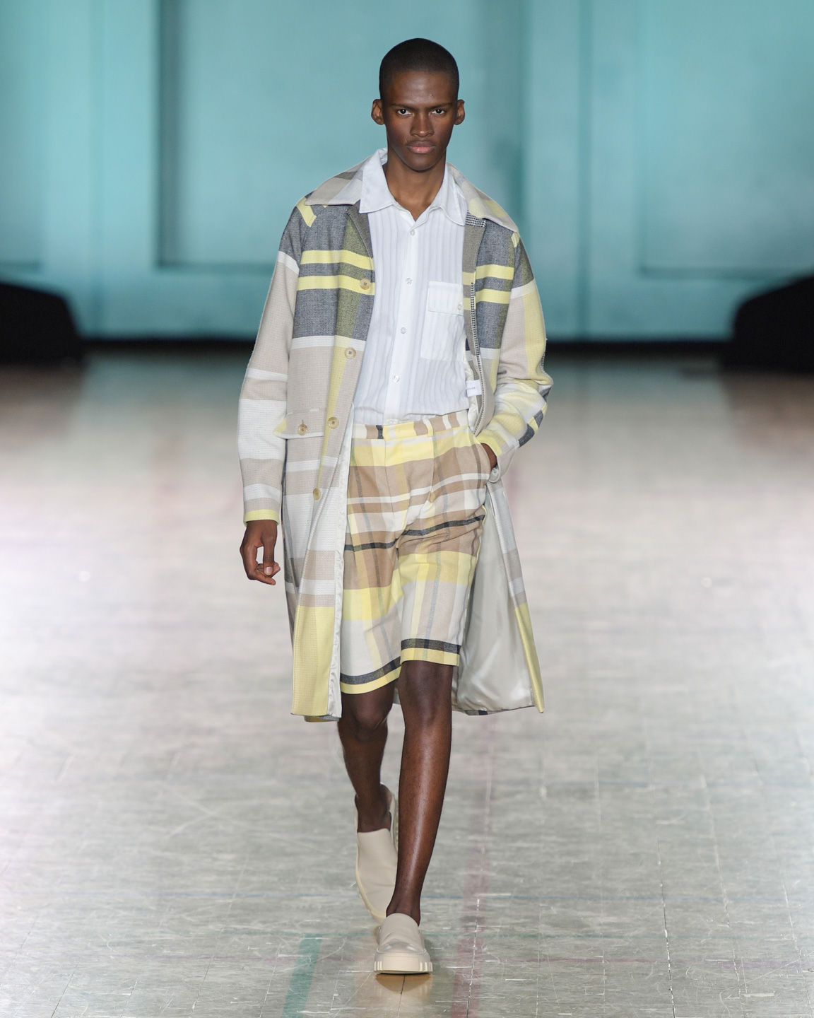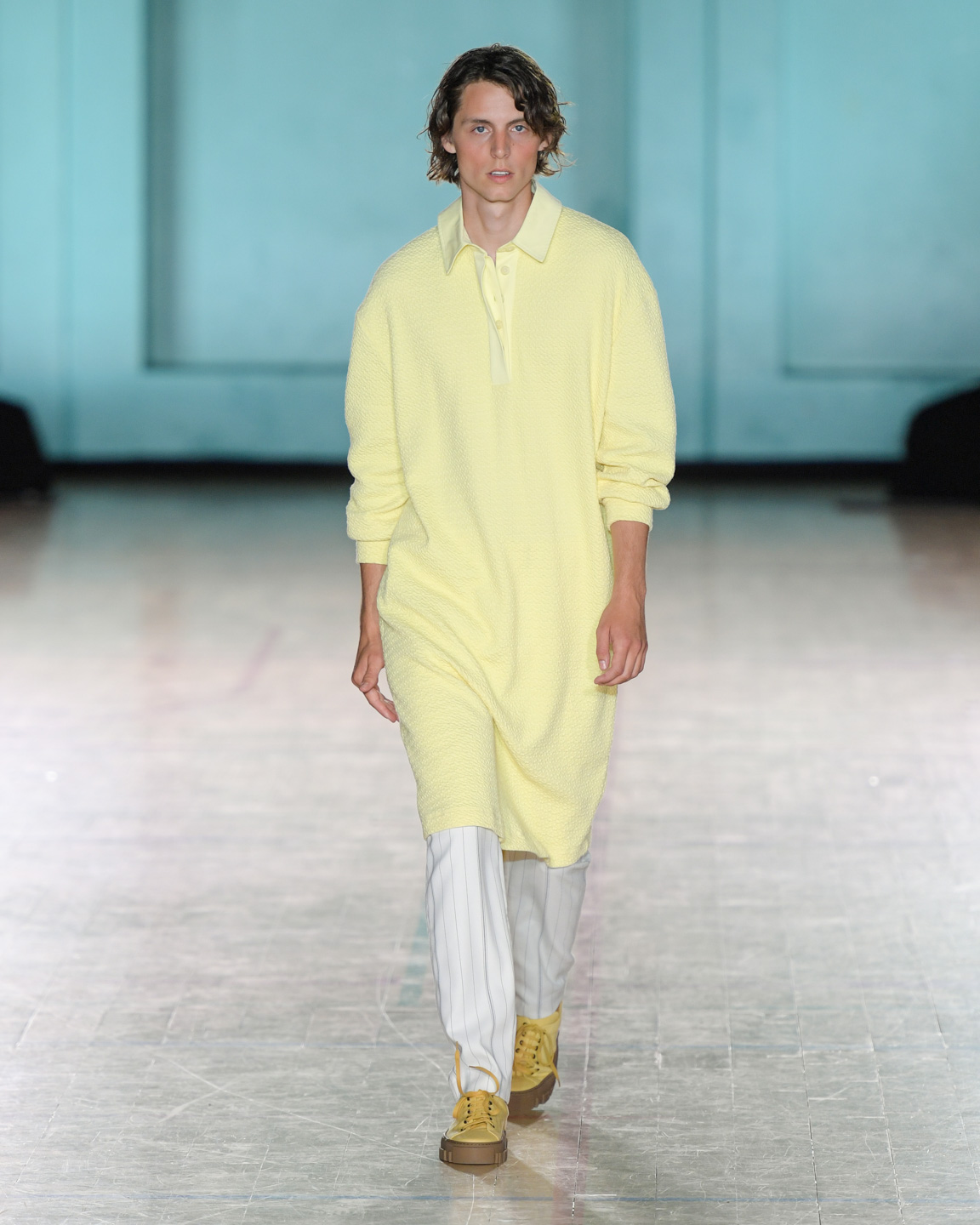 Holzweiler showed menswear staples which were elegant and warm at the same time. The color palette featured mostly neutrals with a splash of orange and creamy yellow. The patterns paid homage to Holzweiler’s scarf-origin in a subtle way. While other brands went colorful or pattern-heavy, Holzweiler kept it minimalist and utilitarian, with a foot in sportswear and another in sharp tailoring.