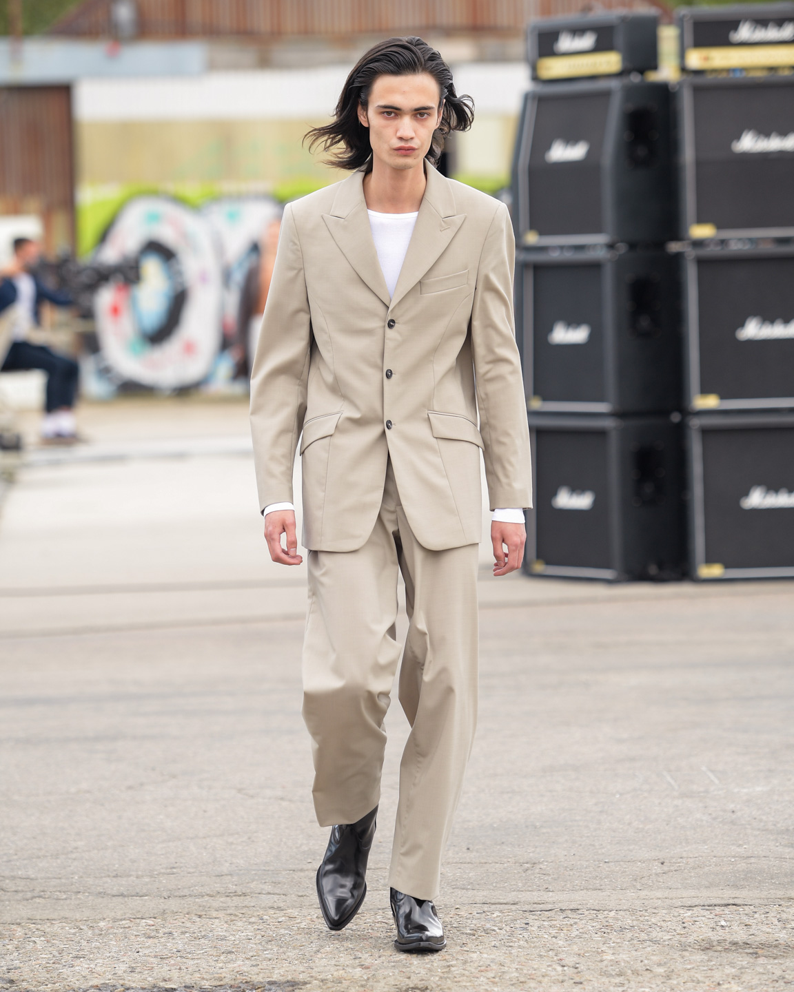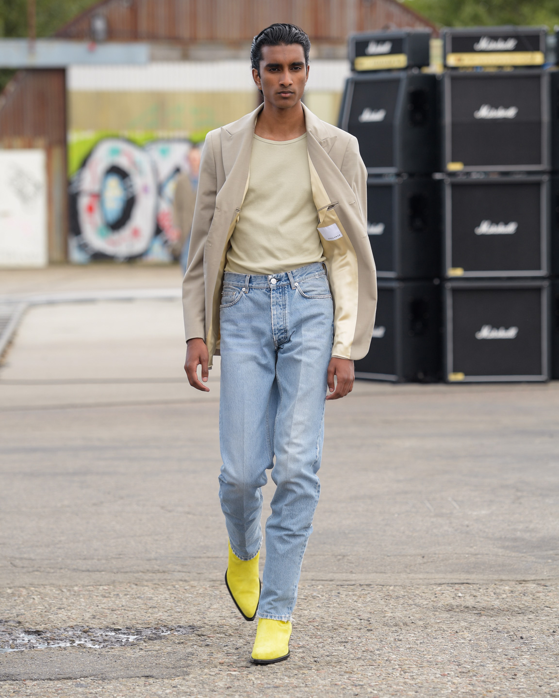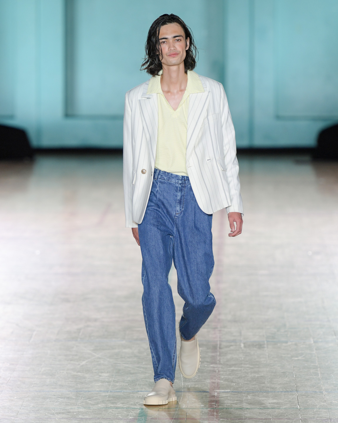 Sunflower presented its third collection, “Neon Country,” with an aesthetic that could be described as “Scandi cowboy on a night out.” Laid-back tailoring was combined with shiny shirts, white denim, black leather coats, and an occasional splash of neon pink and yellow. The secret stars of the show were the cowboy boots that carried the models over the runway.