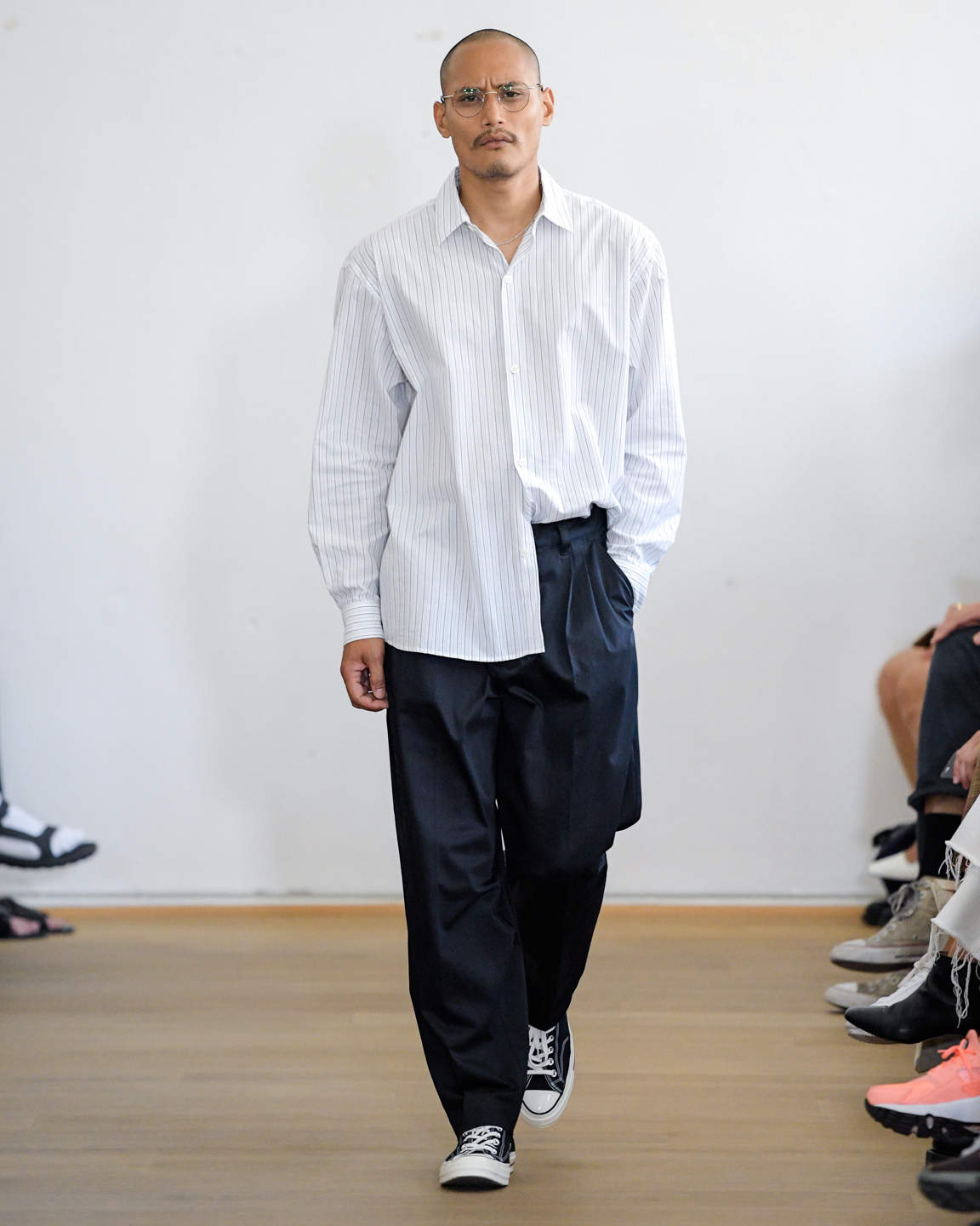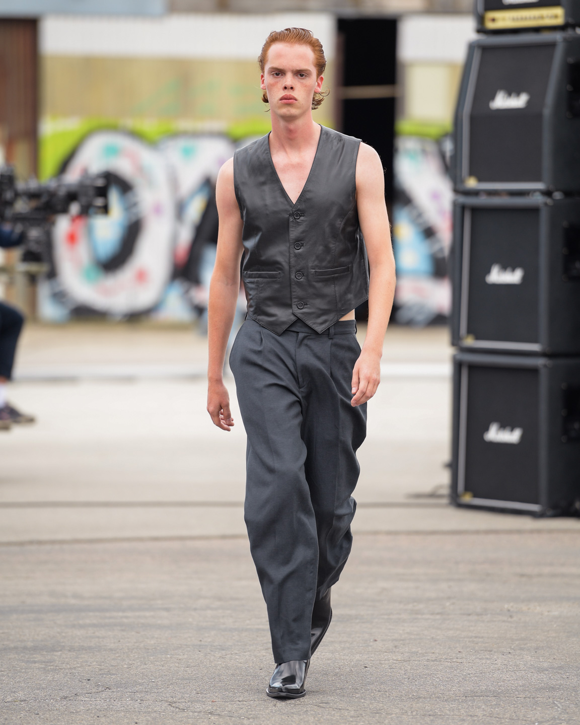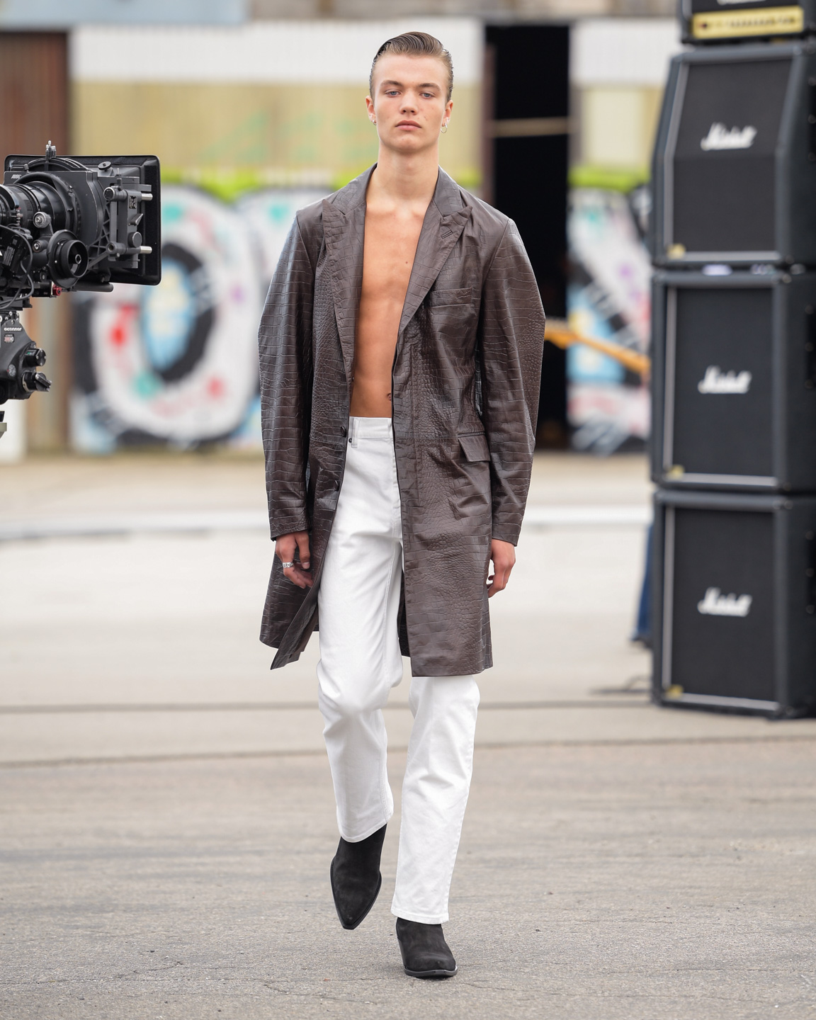 Sunflower presented its third collection, “Neon Country,” with an aesthetic that could be described as “Scandi cowboy on a night out.” Laid-back tailoring was combined with shiny shirts, white denim, black leather coats, and an occasional splash of neon pink and yellow. The secret stars of the show were the cowboy boots that carried the models over the runway.
