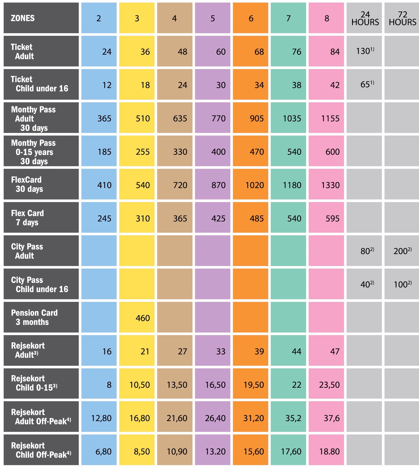 You will find these maps at bus stops and stations, or here, this zone finder tool where you enter your current location to see how many zones you are away from your destination. On this site, you need to enter your current location where is says “Se zonekort for Hovedstadsområdet, then click the button “Vis Zonekort” meaning “see the Zone Map”. There it will show you the coloured zones beyond your own. Unfortunately there is no legend on this page to indicate how many zones per each colour, so have a look at the following legend below with prices.