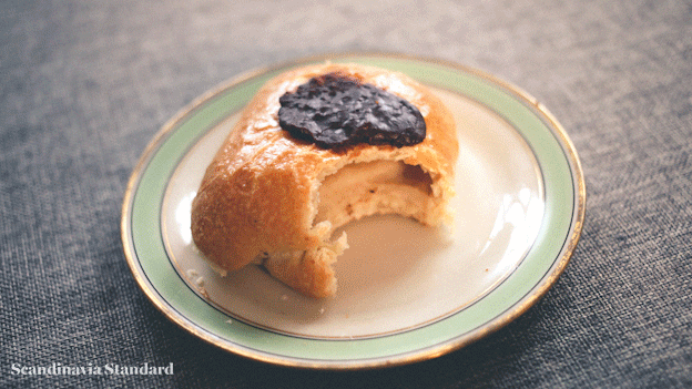 This is the traditional fastelavnsboller: a sweet doughy bun. Inside there is a soft custard and chocolate on top. This type of fastelavn bun isn’t available in all bakeries: La Glace and Holms Bager don’t make them, while Emmerys, Lagkagehuset and Meyers Bakery do.
