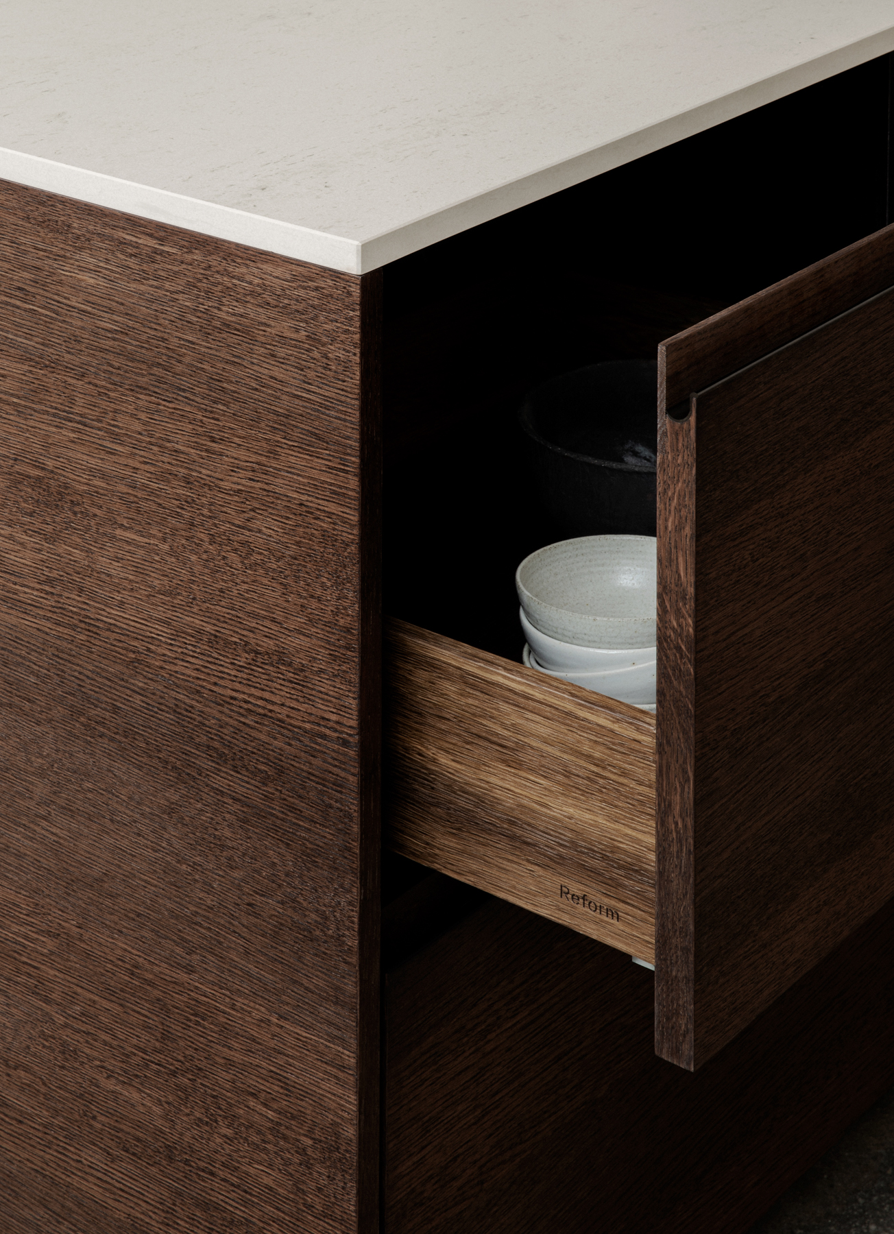 It has always been our aim to offer a high-quality interior that matches our award-winning exterior. To achieve this goal we’re set out to explore future-focused methods within craft and technology and as a result and natural extension to what we already offer. We’ve launched our own line of cabinets that assembles with a patented click system, without any tools or screws. This makes Reform your one-stop kitchen supplier.