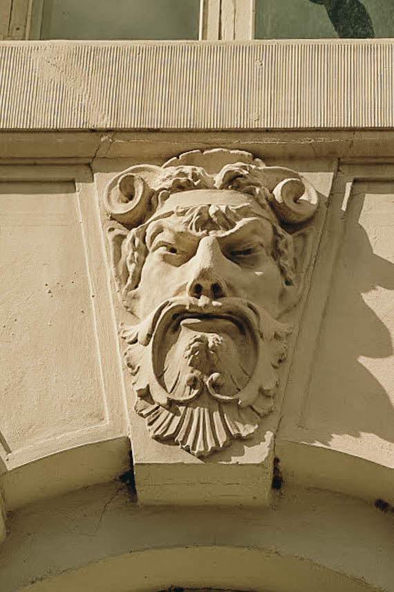 The facade includes satyr faces placed as window keystones. Satyrs were woodland creatures in Greek mythology (their Roman equivalent are fauns) blending human and horse or goat features, and they were commonly used as building adornments in this period throughout Europe.