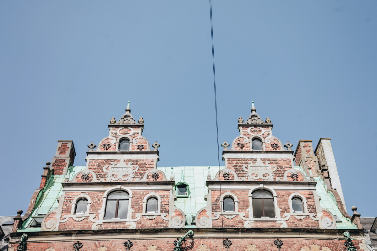 Located in Copenhagen’s main pedestrian shopping district, Amagertorv 6 is primarily known as the home of the Royal Copenhagen porcelain store facing the street and Royal Smushi Cafe, situated in the courtyard. But look to the upper part of the building and you’ll see gabled roofs, a patterned brick facade, stone and metal detailing, and panels bearing the years 1616 and 1898.