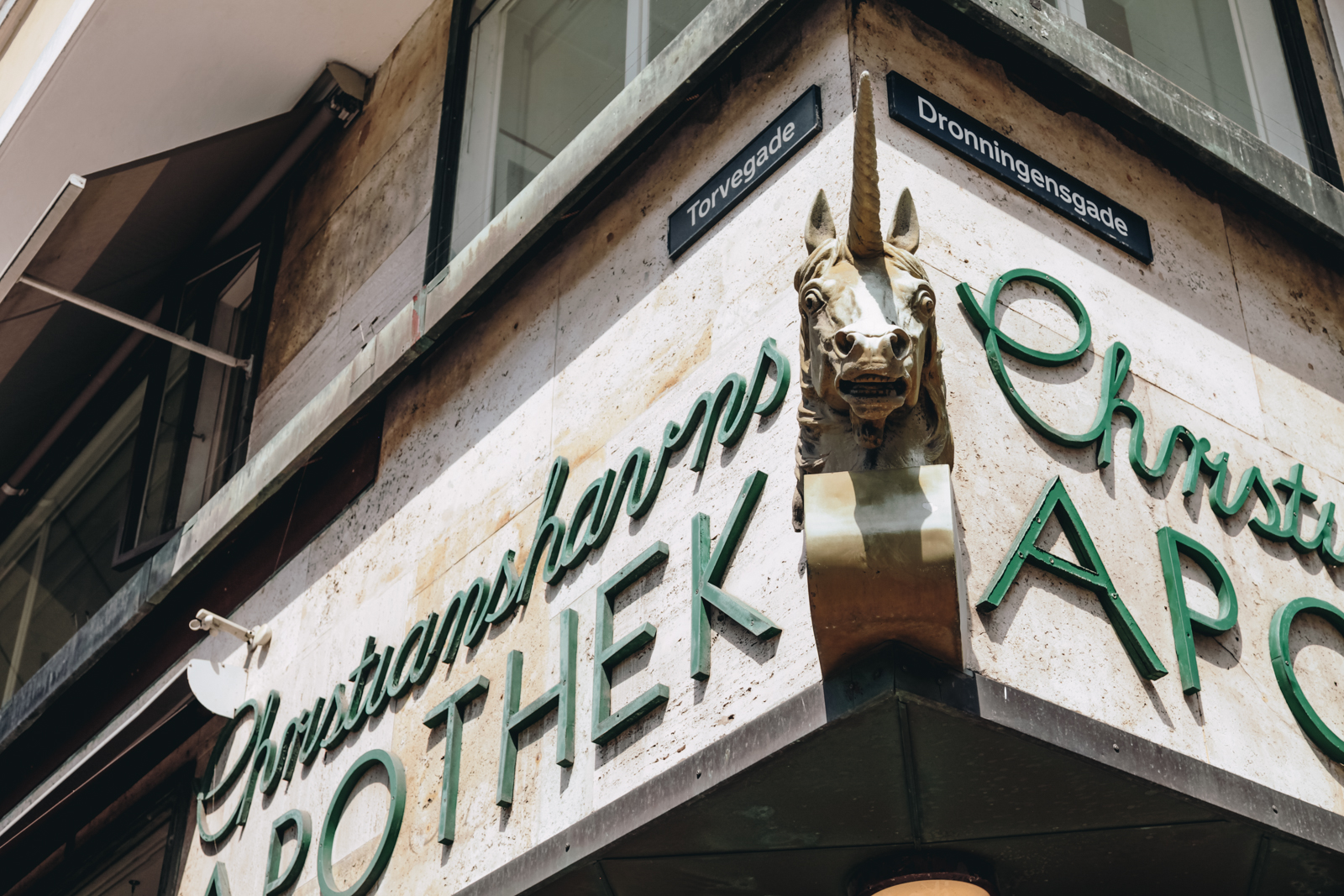 Ironically, although Lagkagehuset is a Funkis pioneer, one of its best known features is a piece of applied art one might expect on a Neoclassical building. Christianshavns Apotek, a pharmacy founded in 1707, moved here when the building opened and still remains to this day. Its trademark is a unicorn head sculpture affixed above the corner entrance. This adornment wasn’t tacked on later; it’s shown in Thomsen’s plans.