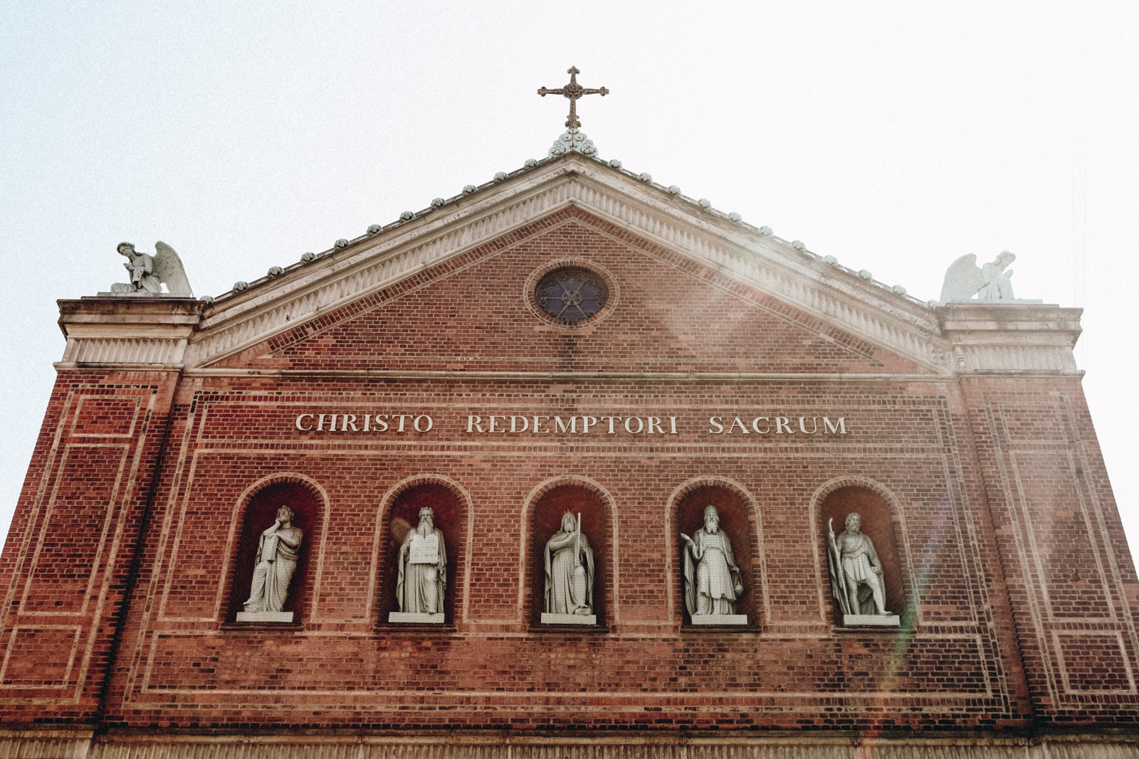 The church stands out in other ways, with attractive artwork set against restrained brick walls. Most striking are the five large zinc statues set in niches on the facade. They depict Old Testament prophets, each holding items typically associated with them. Isaiah has a book; Moses has the Ten Commandments; David has a crown and a harp; Aaron has a censer (incense burner); and Elijah has a staff.