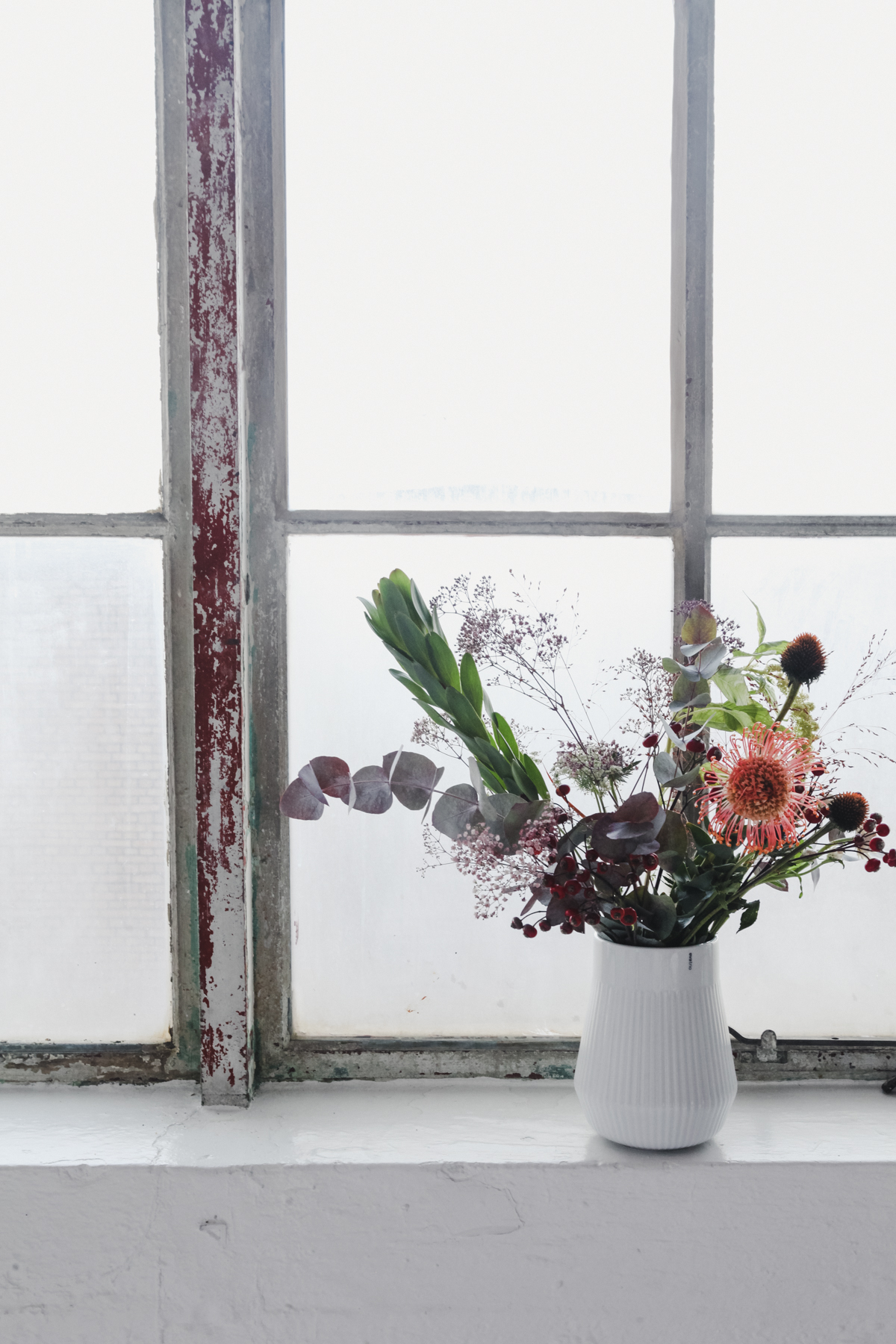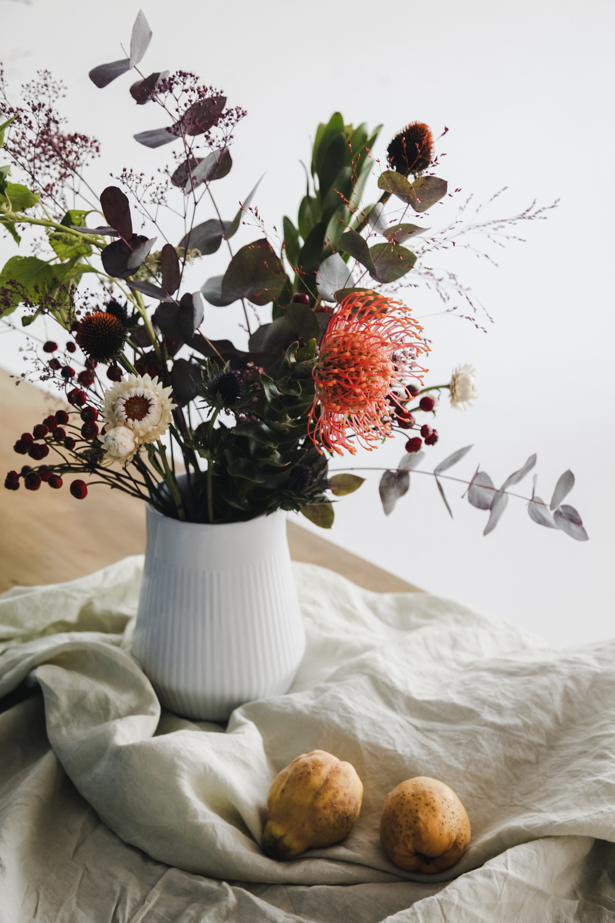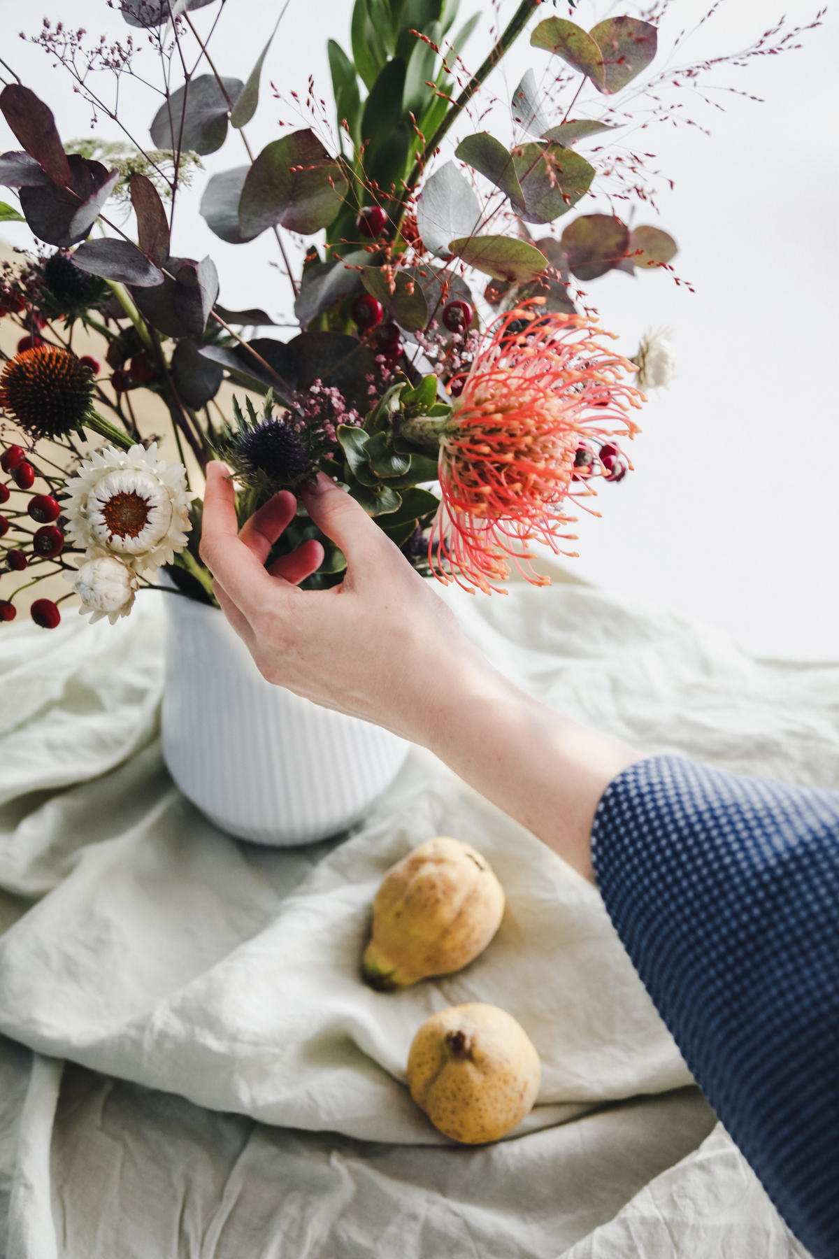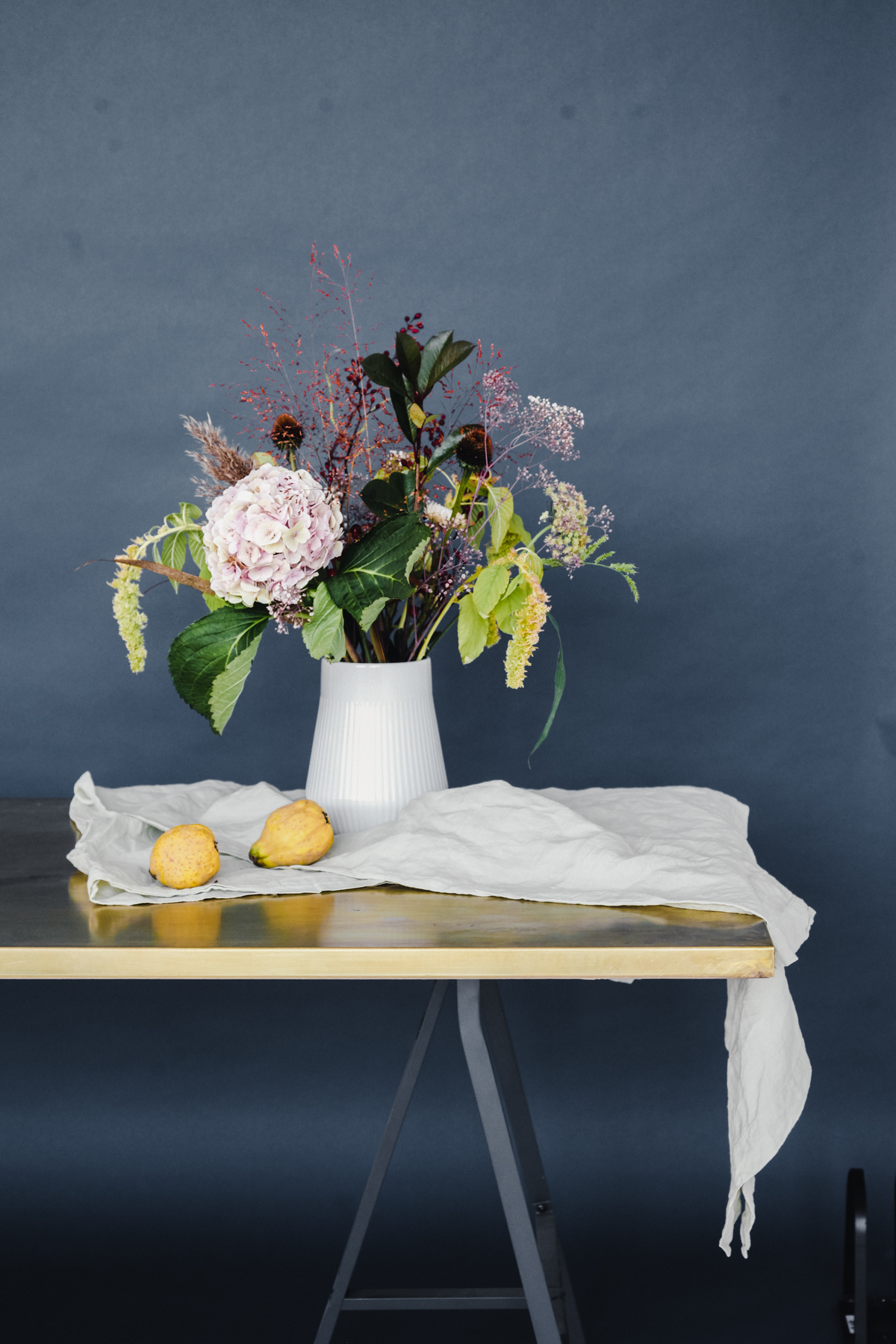 After perfecting the bouquet, we were able to use the studio space at The Lab CPH to style and photograph our work. The incredible light paired with the lush bouquets for a truly gorgeous series of photos. Adding pops of color and texture, such as fabric, fruits, and colorful backdrops, allowed us to really dig into still-life inspiration like the works of Dutch Masters such as Vermeer and van Huysum.