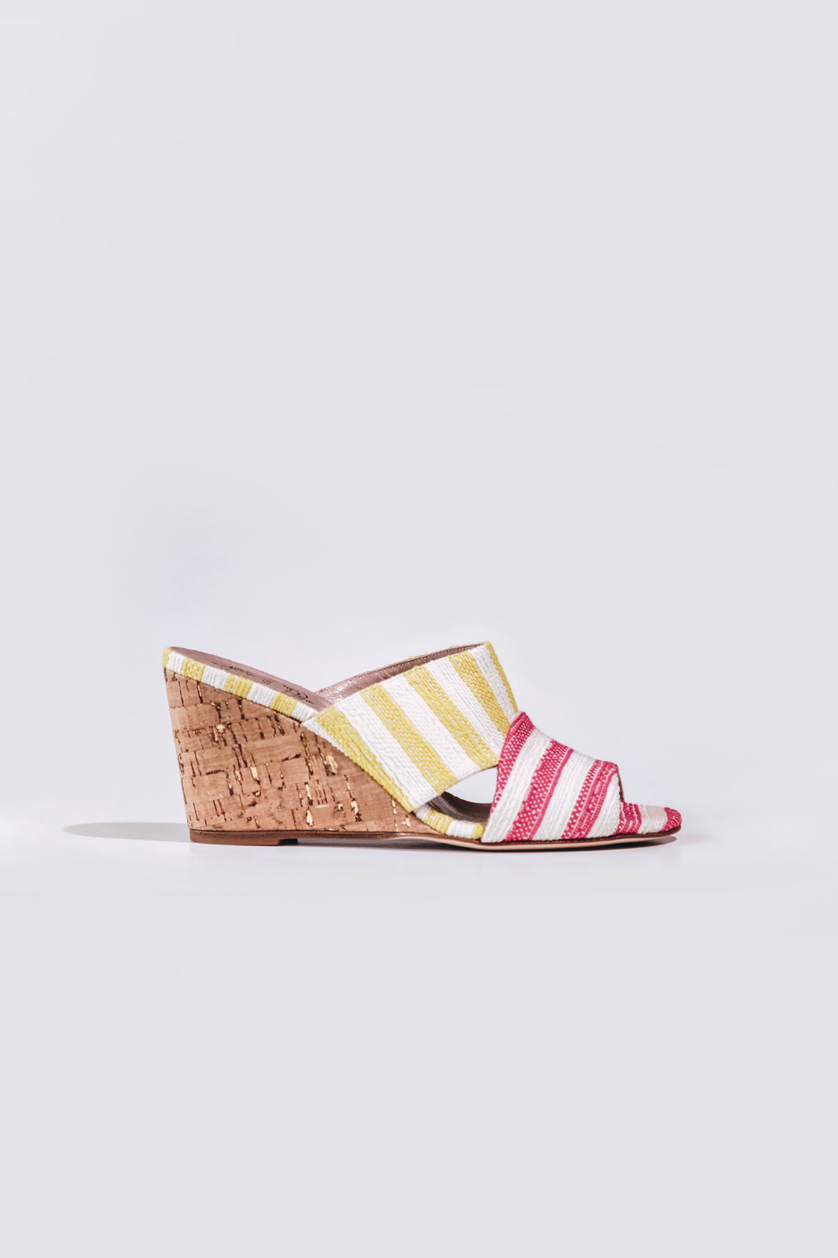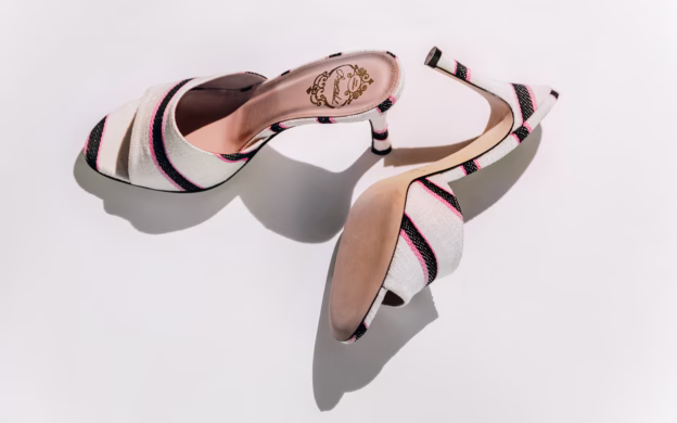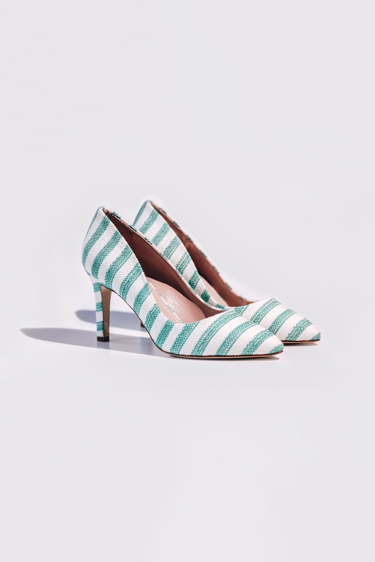 Eva Bartels arrives to our meeting wearing a pair of her own shoes, of course. The yellow and black stripes stand out against the white cotton, with a mid-size heel and a clean, open-toe mule silhouette. It is clearly a very good shoe.
