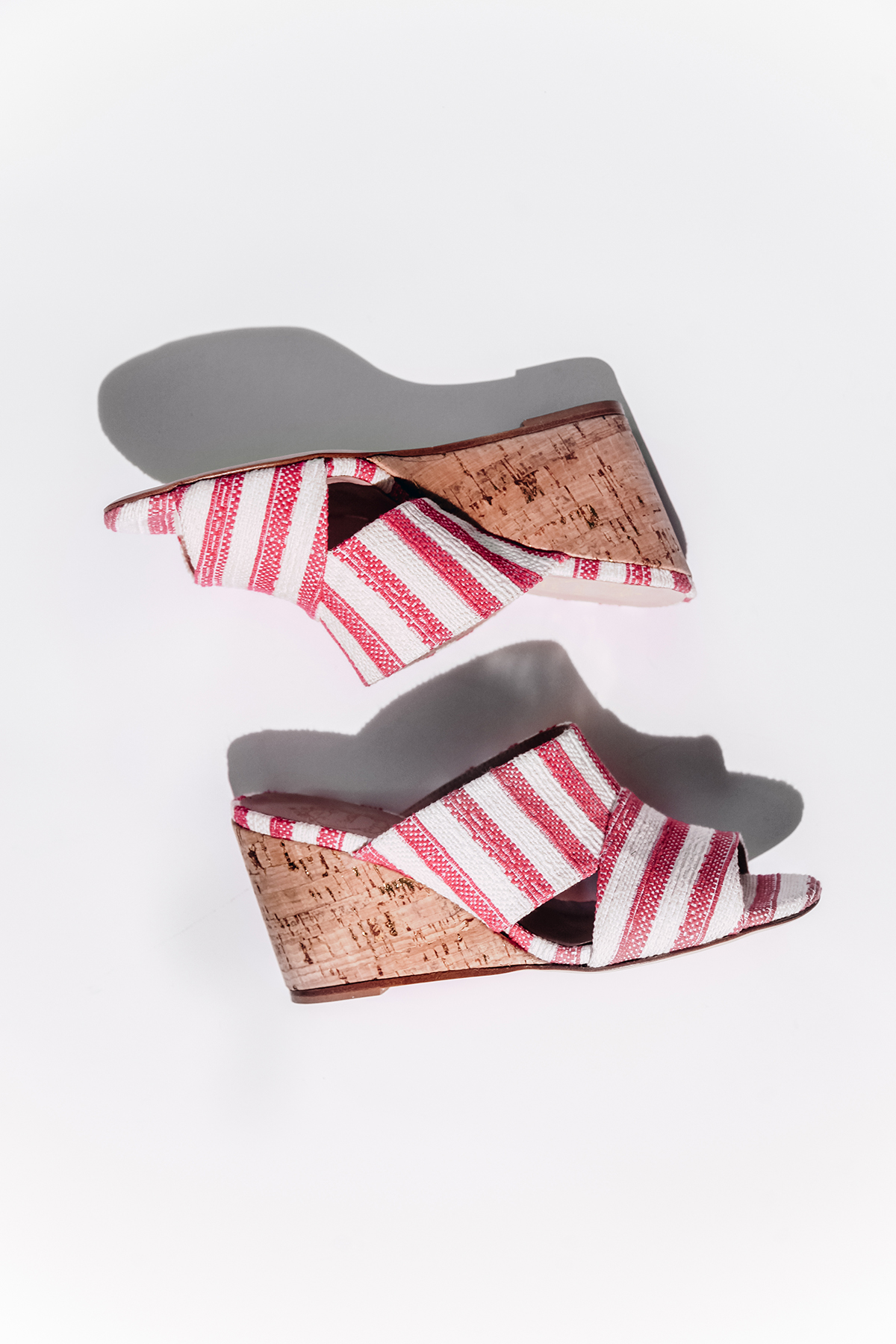 While searching for fabric, she came across deadstock that had been used for parasols in Italy. That’s the striped pattern you see on her shoes today. “I thought, wow, this is really unique. The fabric has a story, just like Bartels does.”