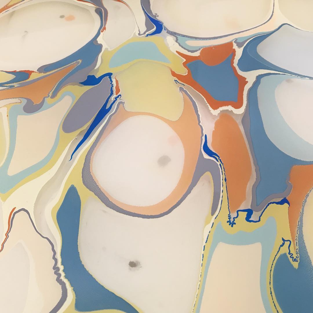 On a trip to London in 2014, Julie found a paint marbling kit and tried it out. “I thought, wow, this is really cool. It wanted to learn more about it; not just the process, but the history and the context.” She spoke with Anne-Sophie about it, and they decided to run a few workshops. In 2015, they found an inexpensive studio space large enough to accommodate guests and held a series of paint marbling events. “We weren’t trying o build a brand or anything,” Julie says, “we just did what we wanted to do and went with it. For me, the workshop aspect was always going to part of anything I do because I am naturally a teacher. Anne-Sophie is so talented with creating visuals, from graphic design to photography, so we knew that would be part of it as well. It’s a really good combination.”
