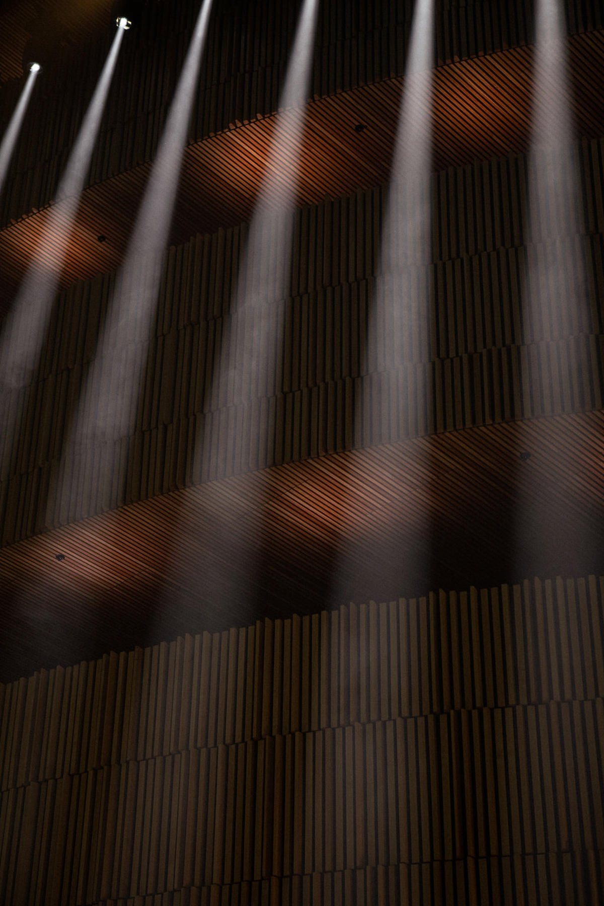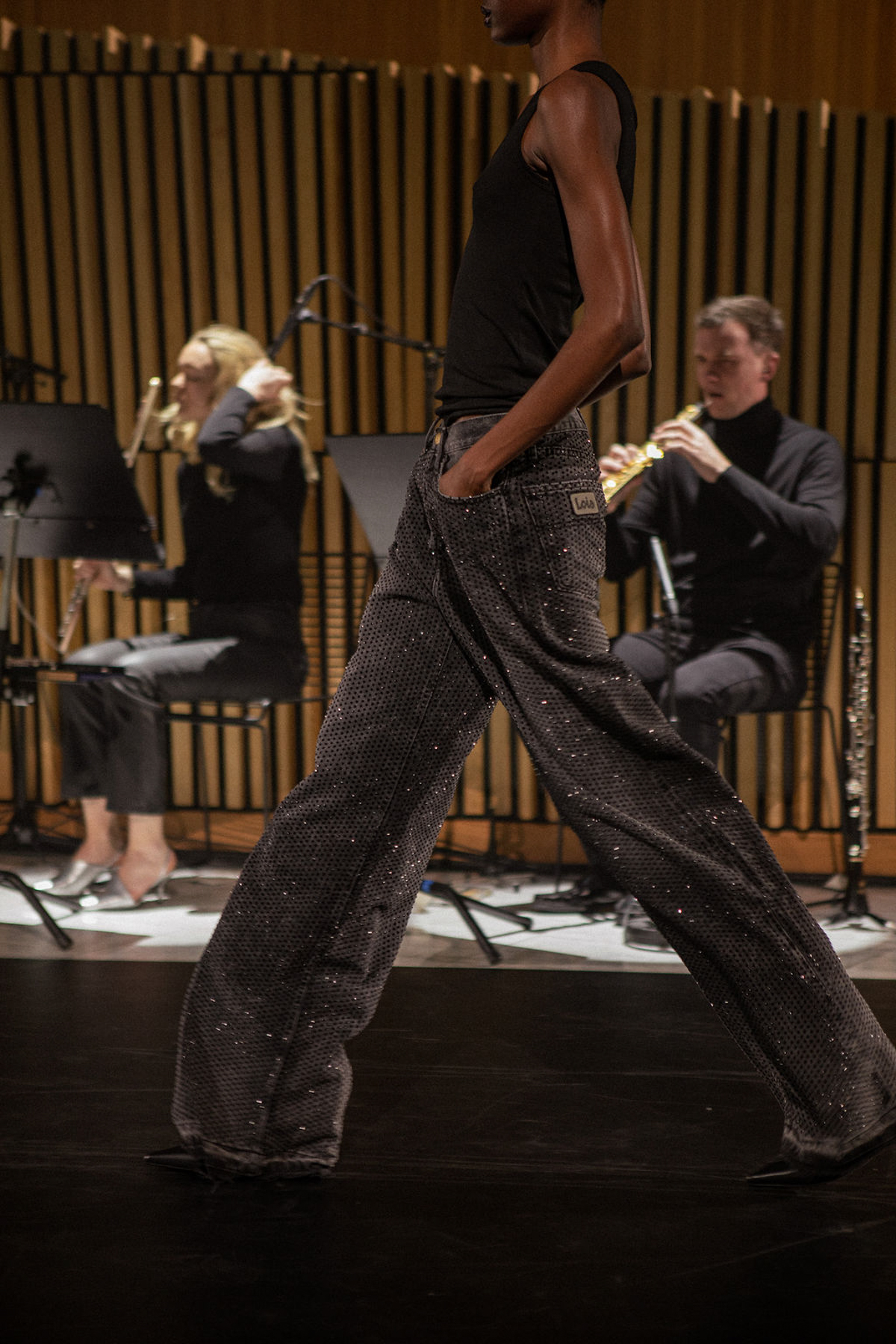 Surrounded by a thick fog, the iconic Oslo Opera House by award-winning architecture firm Snøhetta set the scene for a fusion of fashion, live music, and ballet. Inside, sharp diagonal light beams created a dramatic contrast to the darkness in the rest of the room.