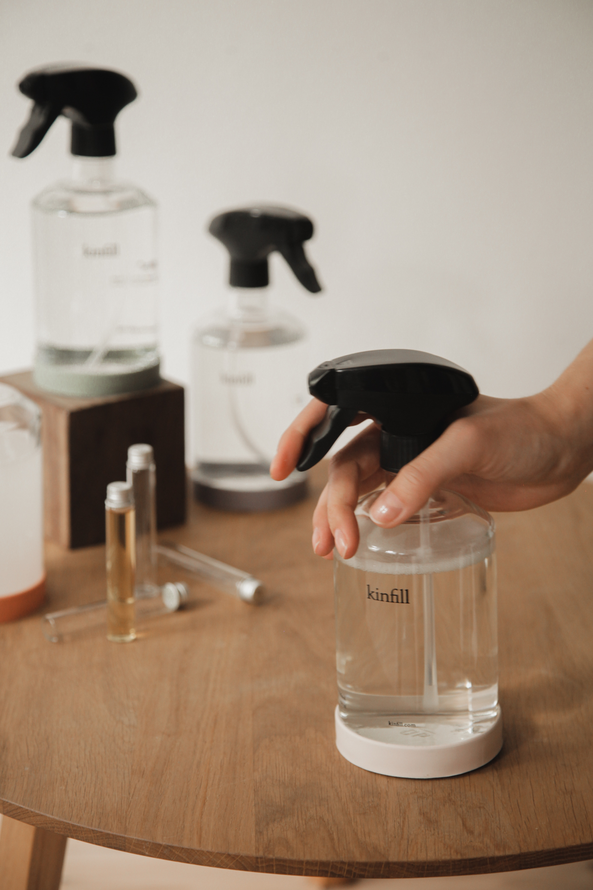 Kinfill bottles are satisfyingly shaped, with a substantial body and short neck that’s easily held, made using crystal clear Italian glass. Their angular tapered tops are reminiscent of poetry, like the lift given to the base of a hand-thrown vase. The logo is small and floats on a sea of cleaning agent, providing little distraction, while the rubber bottle protector adds a subtle hint of color.
