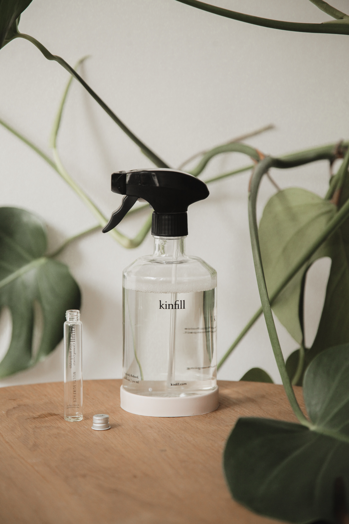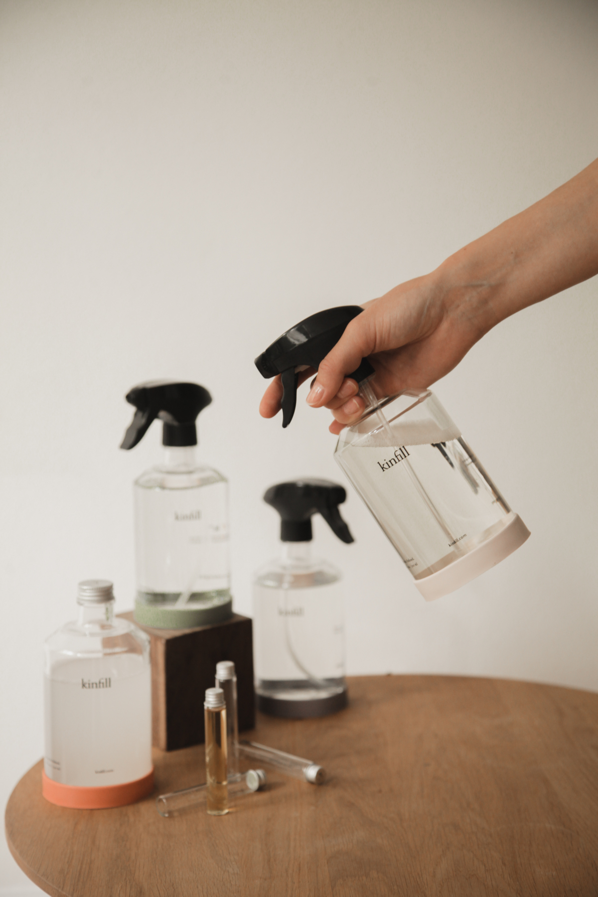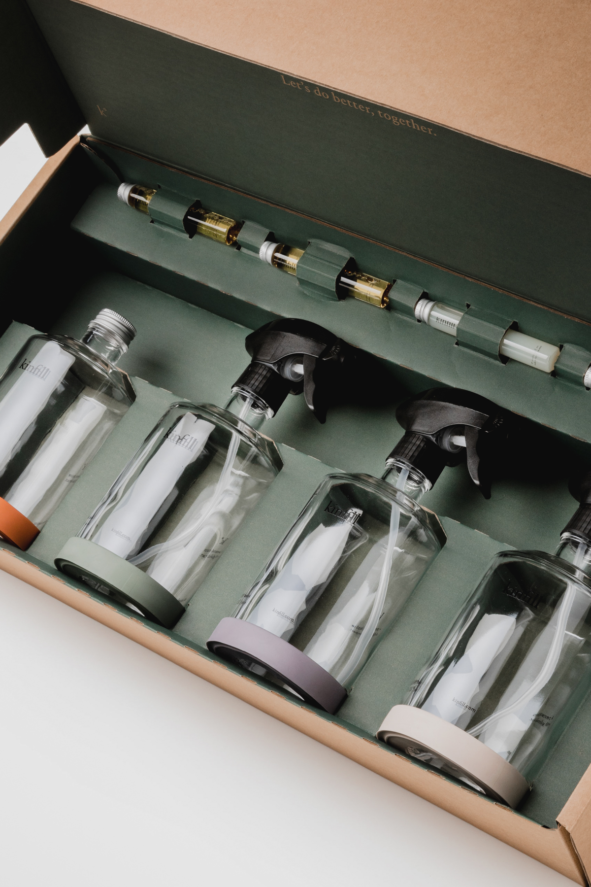 Kinfill bottles are satisfyingly shaped, with a substantial body and short neck that’s easily held, made using crystal clear Italian glass. Their angular tapered tops are reminiscent of poetry, like the lift given to the base of a hand-thrown vase. The logo is small and floats on a sea of cleaning agent, providing little distraction, while the rubber bottle protector adds a subtle hint of color.
