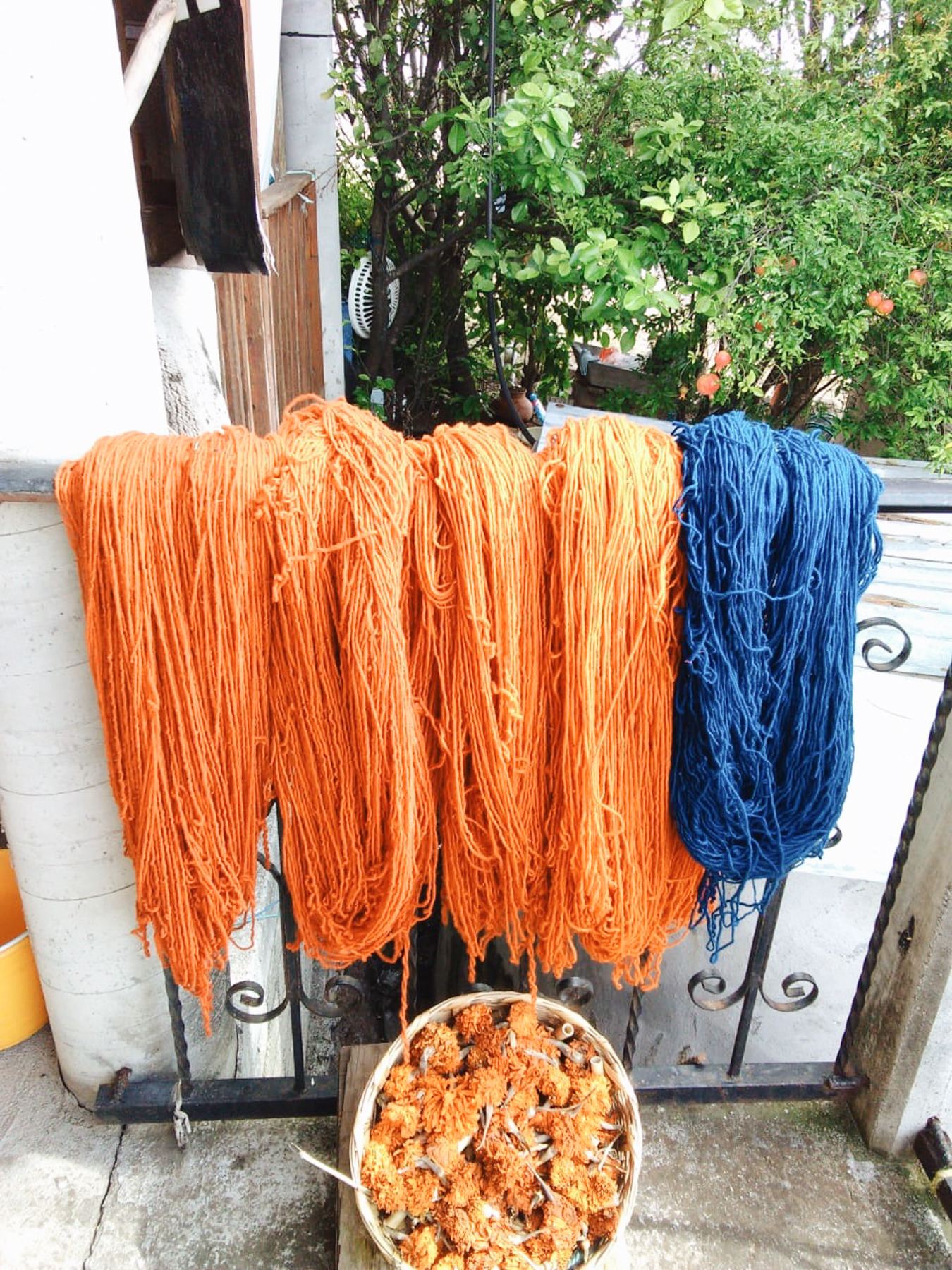 Añil número tres is inspired by Mercado Jamaica, the massive flower market of Mexico City. The color is achieved through dyeing yarn with Cempasúchil flower.
