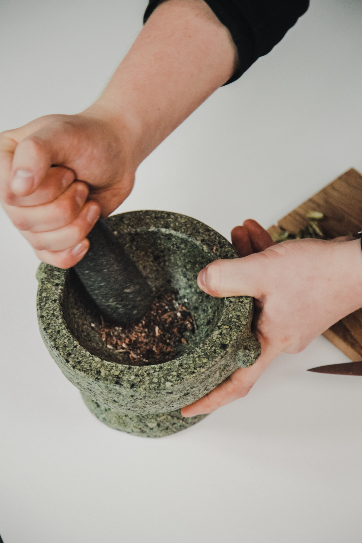 Cut open and scrape out the insides of about 20 cardamom pods. Grind the cardamom seeds finely in a mortar and pestle.