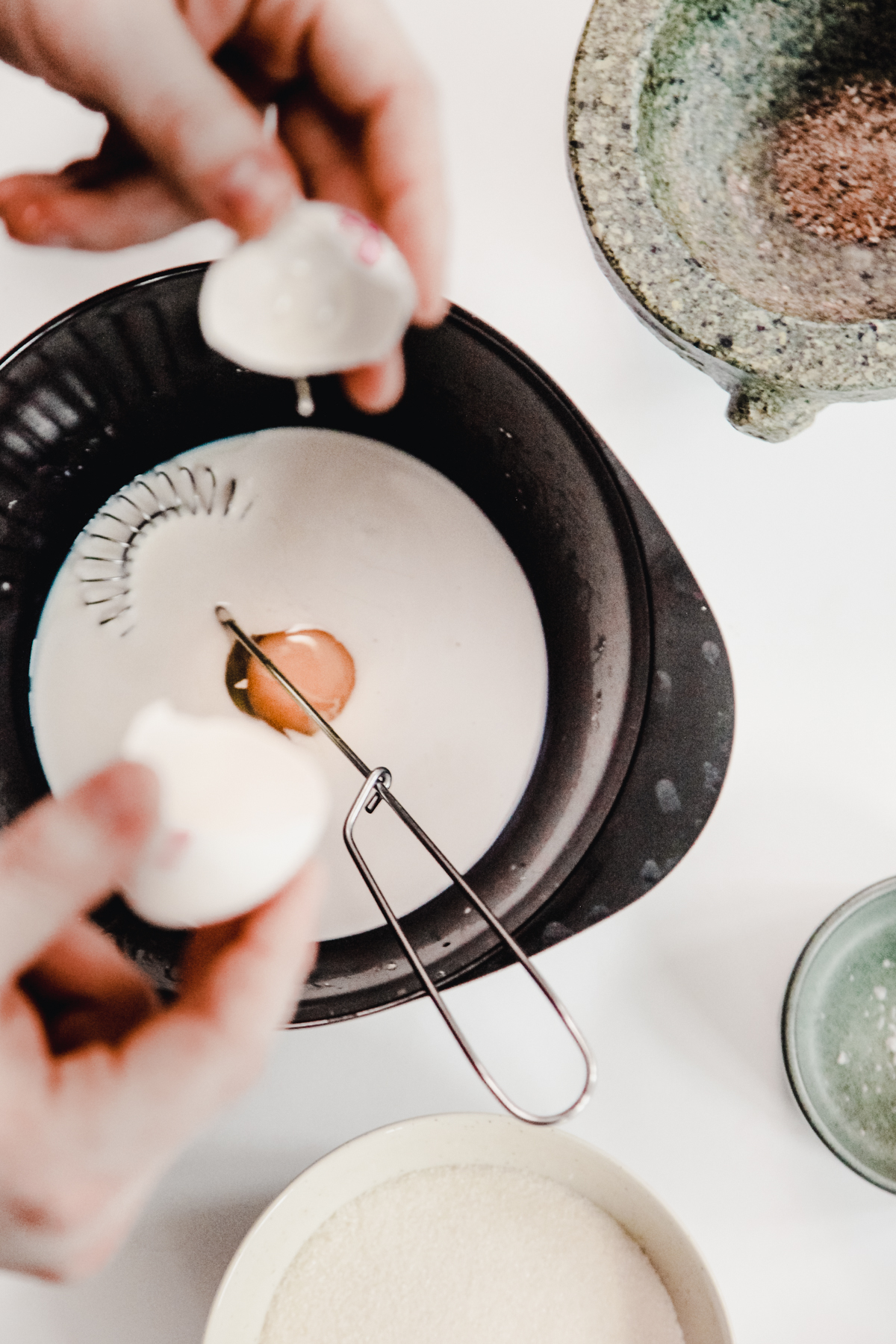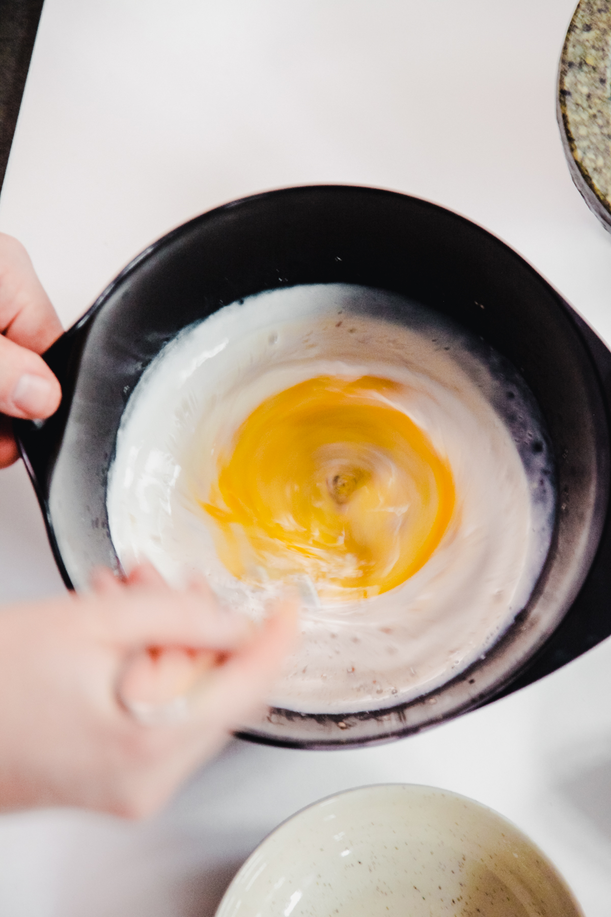 Add an egg, the cardamom, salt and sugar to the milk mixture. Stir until smooth.