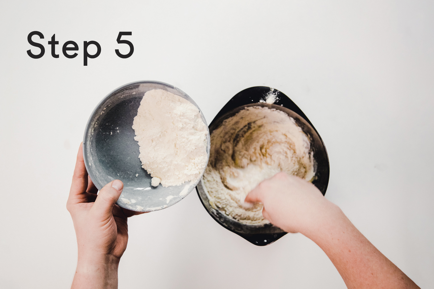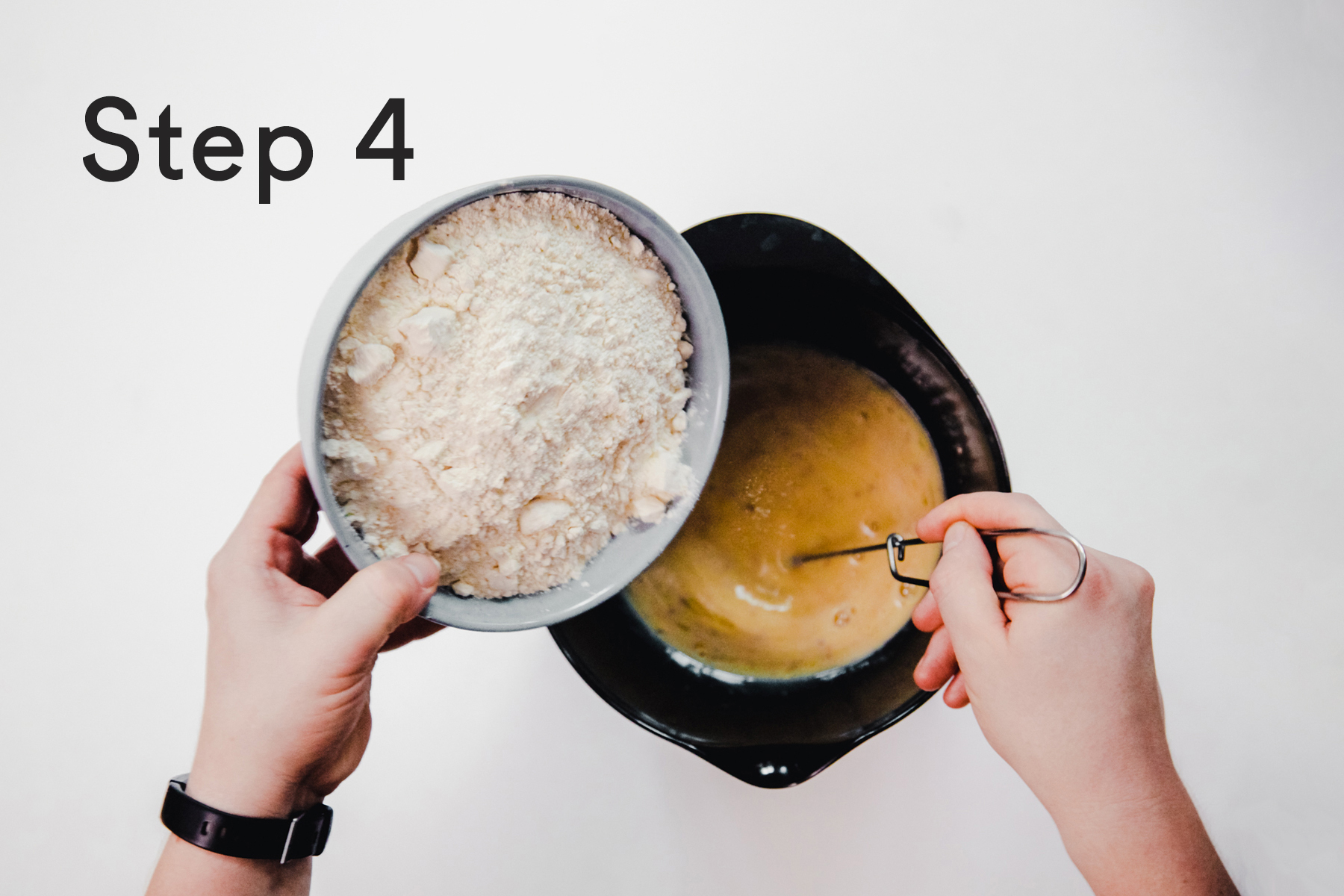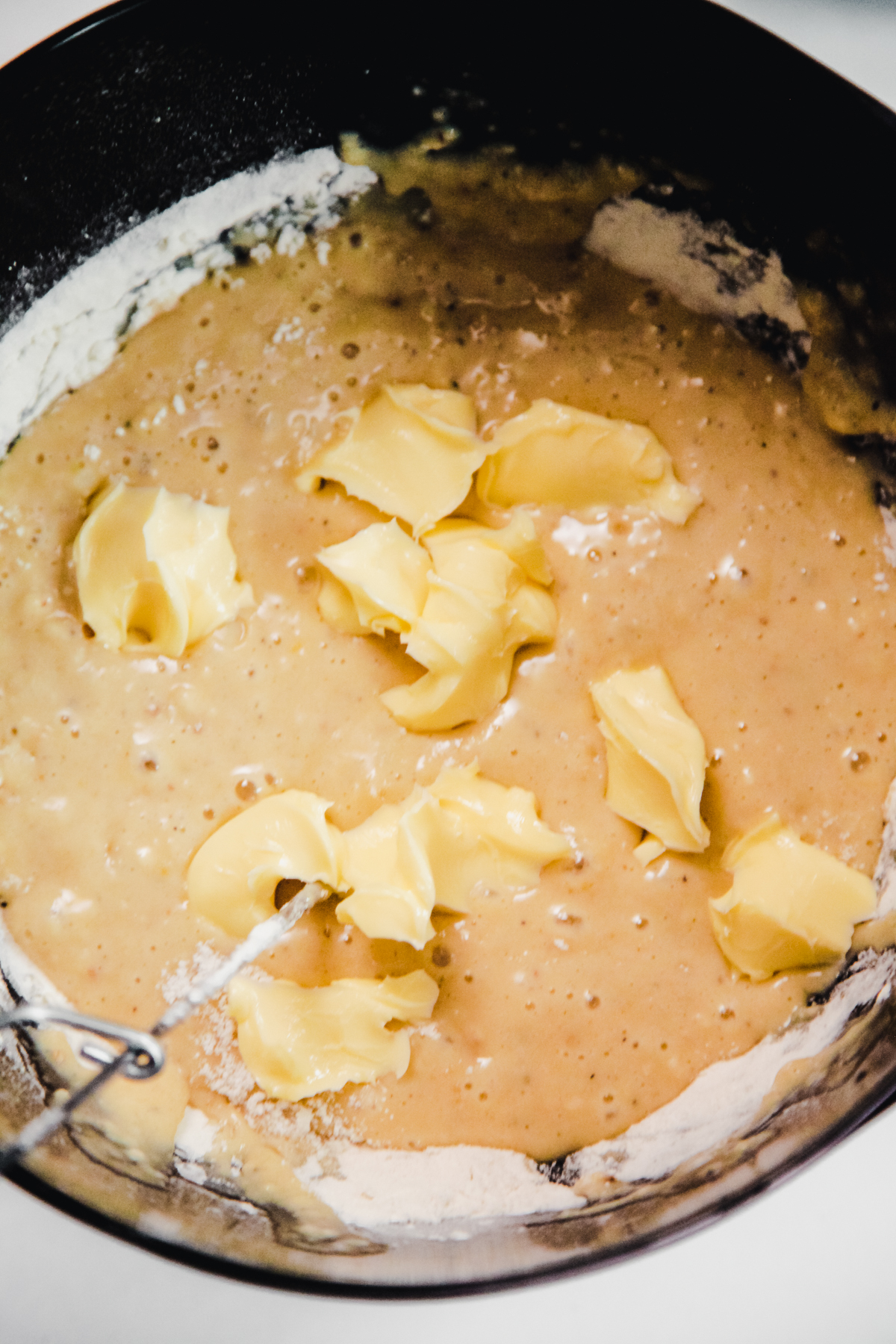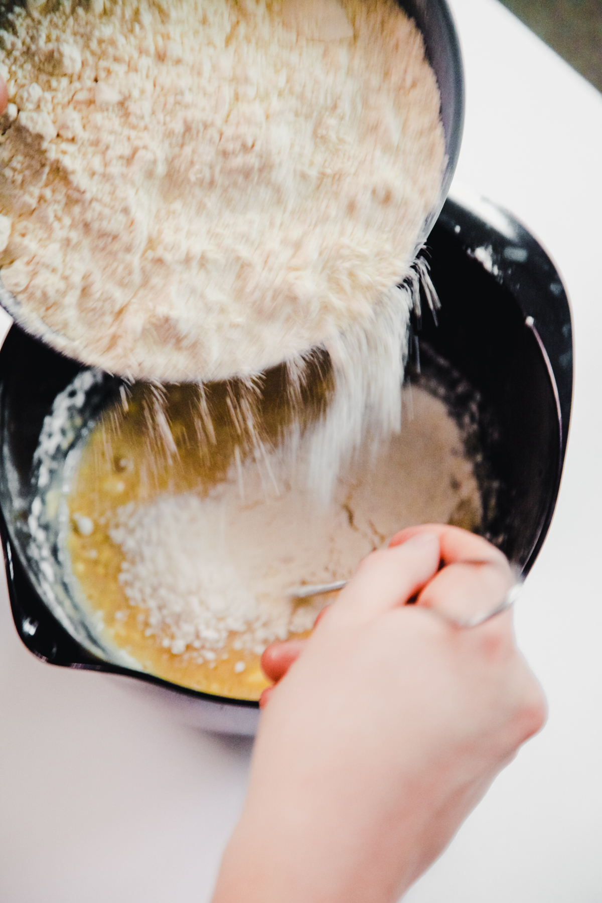 While stirring, gradually add about half the flour. Make sure to incorporate it slowly and in intervals as to prevent lumps. When about half the flour is incorporated. Add the room temperature butter by pinching it into small chunks.