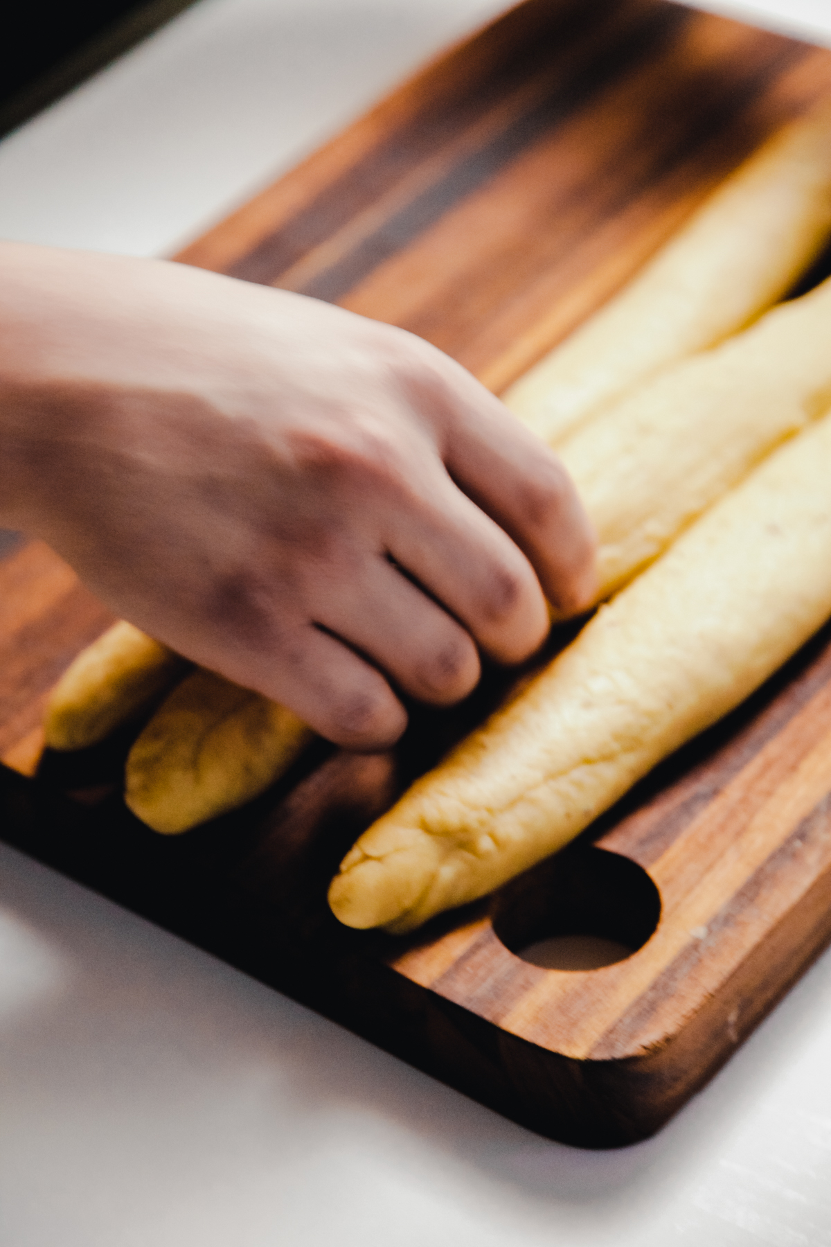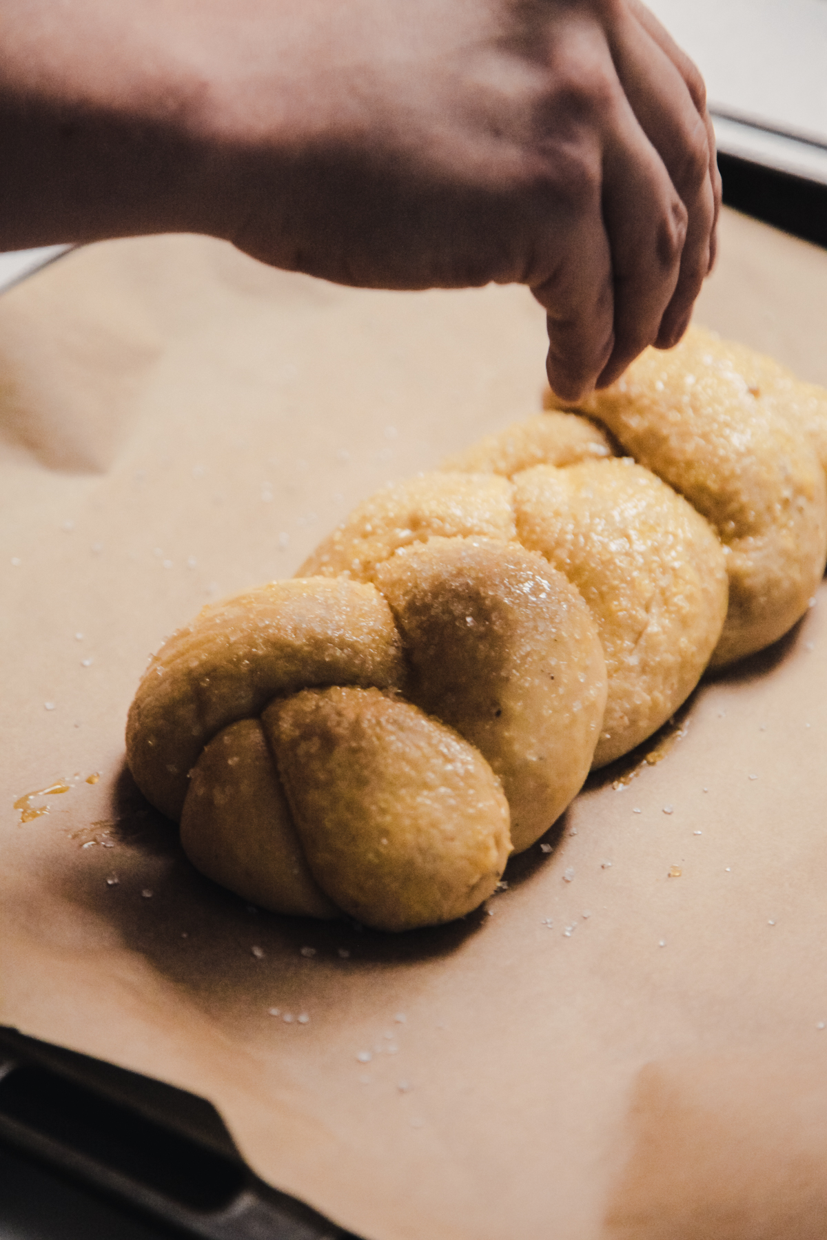 Divide the dough into three even sized pieces and roll them into balls. Roll each ball into a longer cylinder and weave the three ‘ropes’ together into a braid. Place on a baking sheet lined baking tray and let rise for another hour.