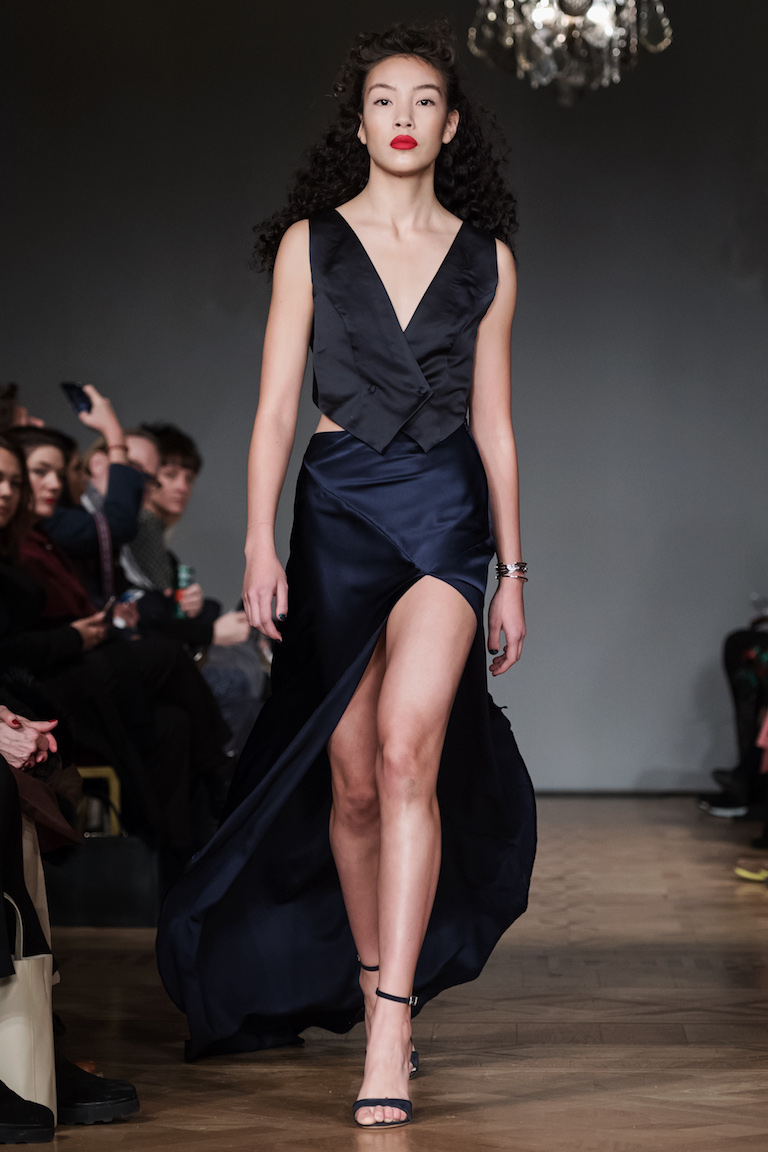 We appreciate that Swedish designer Emelie Janrell does what she wants. There wasn’t a lot of purple on the runways this season, but it was one of her stand-out colors. This velvet jacket and dress combo, with a pop of red in the lining and a little leopard on the collar, could be too much but somehow is just right. Sexy, a little eccentric, and cool. For something a little more laid-back but still unexpected, this black and navy ensemble had us starry-eyed.
